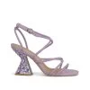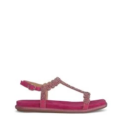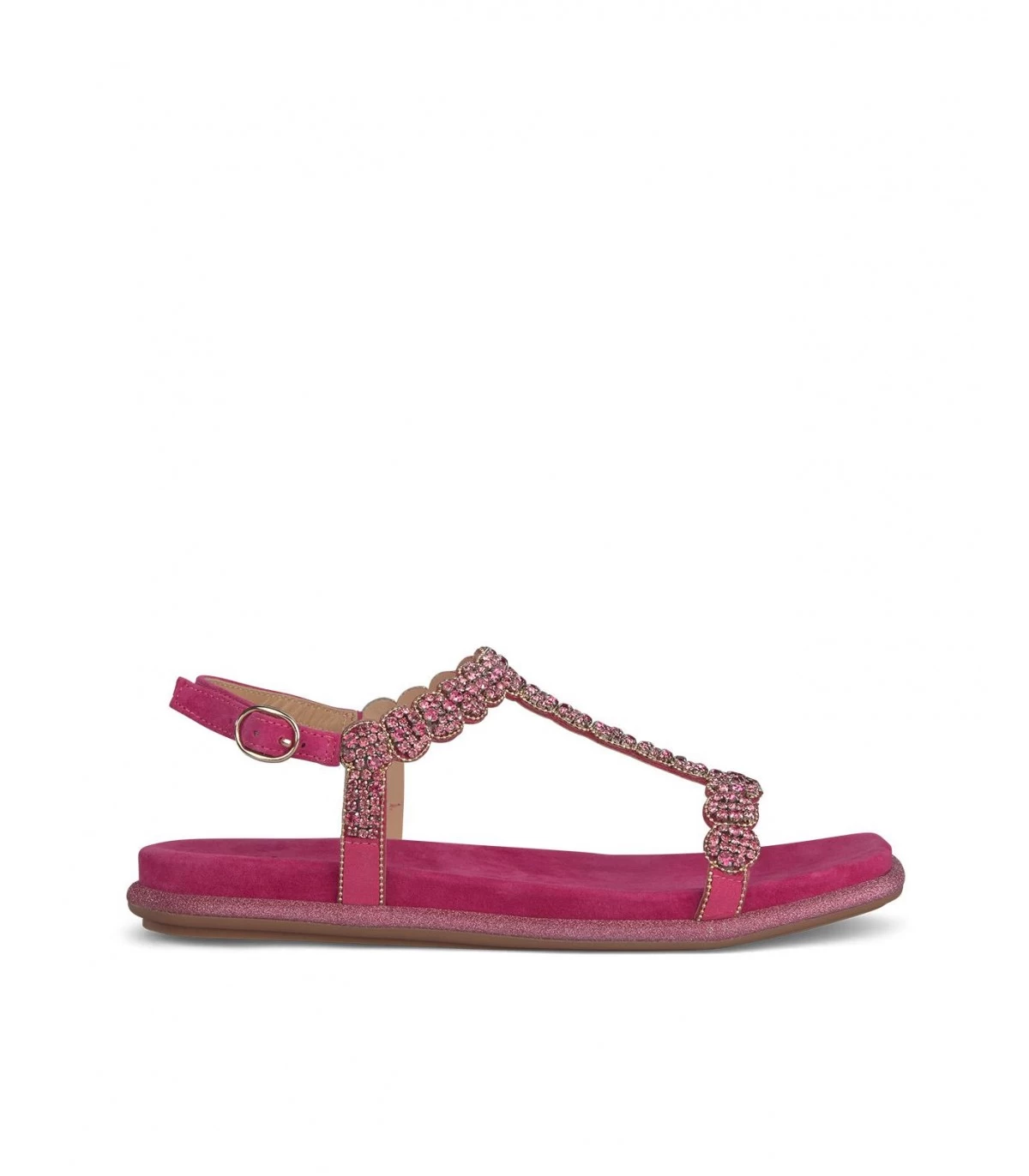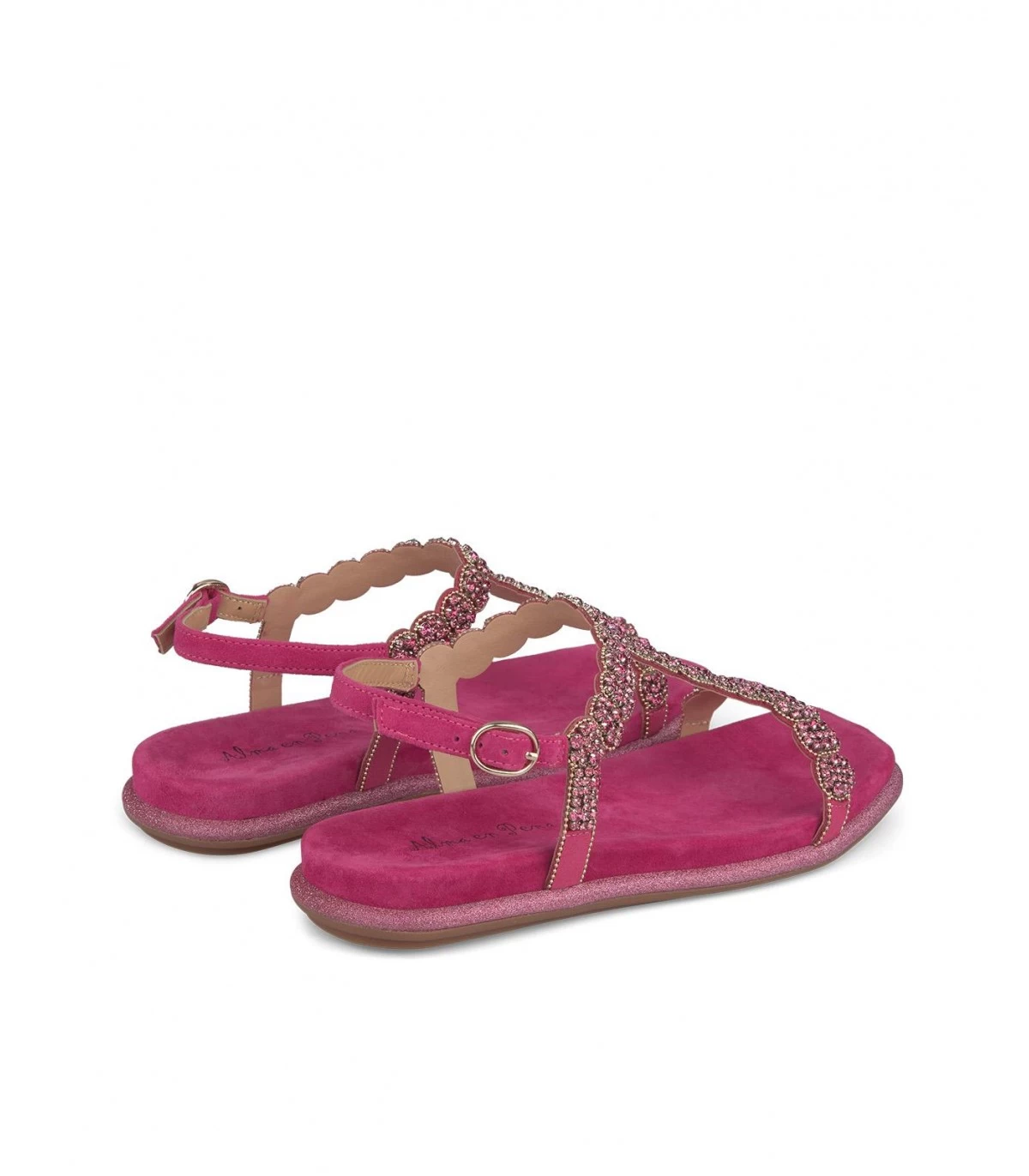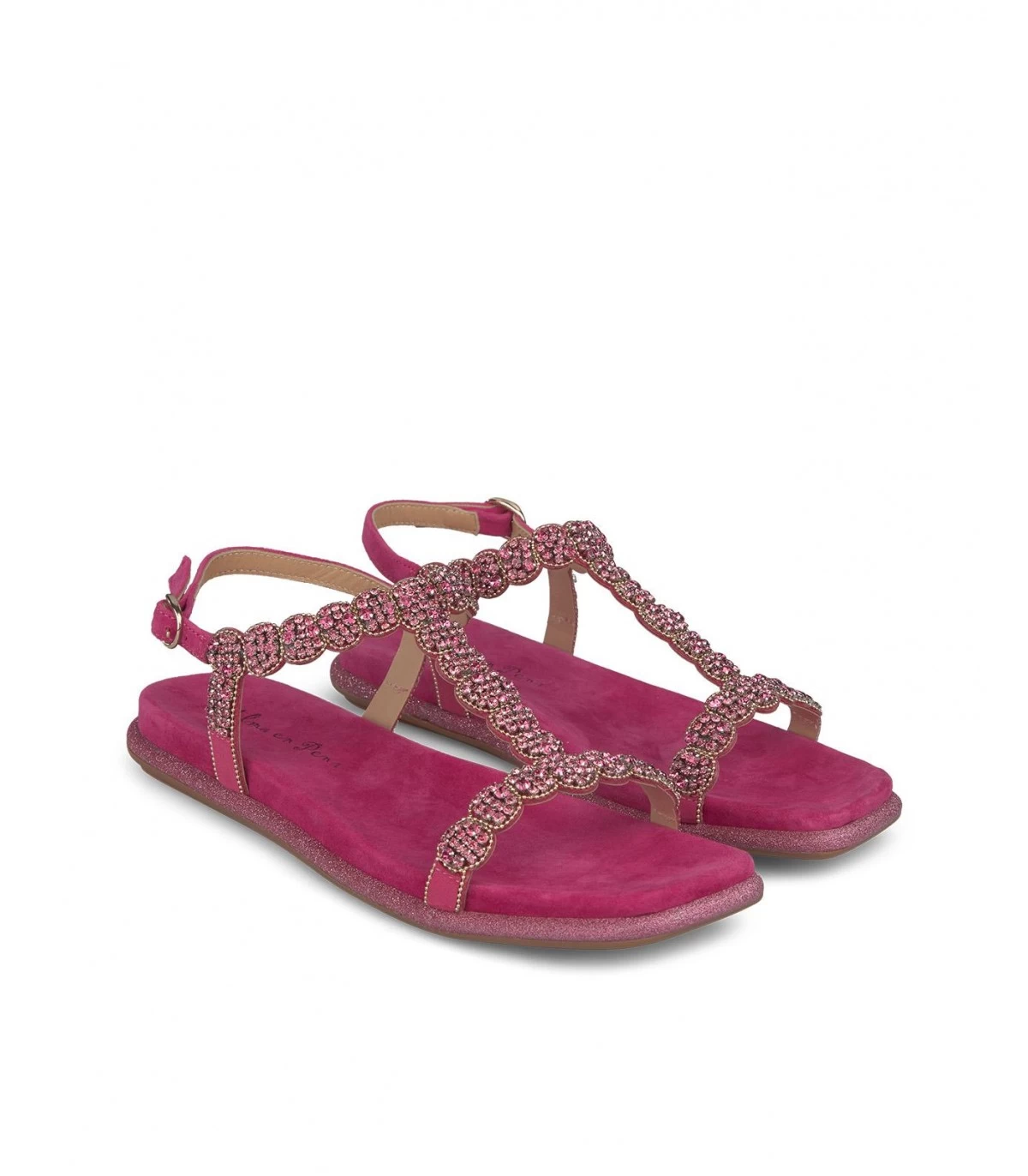 Sandalia plana de piel y punta cuadrada con pedrerÃa. Tira de pedrerÃa en delantero. Cierre con hebilla en tobillo y suela acolchada.
