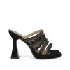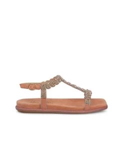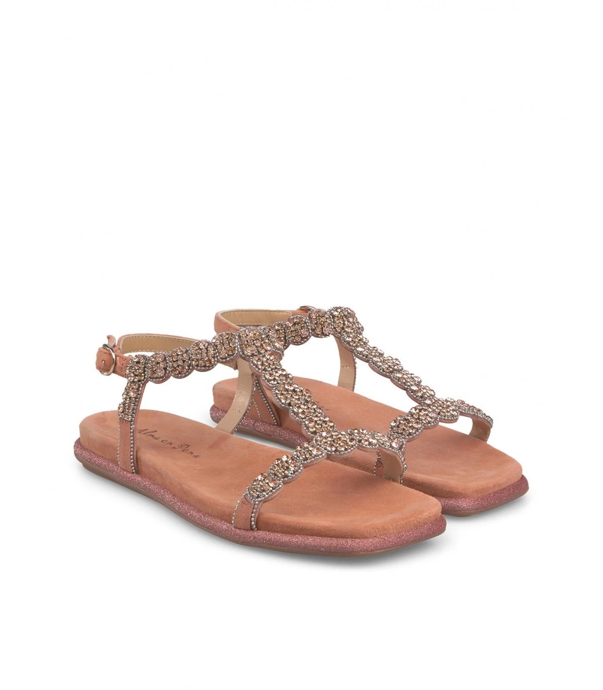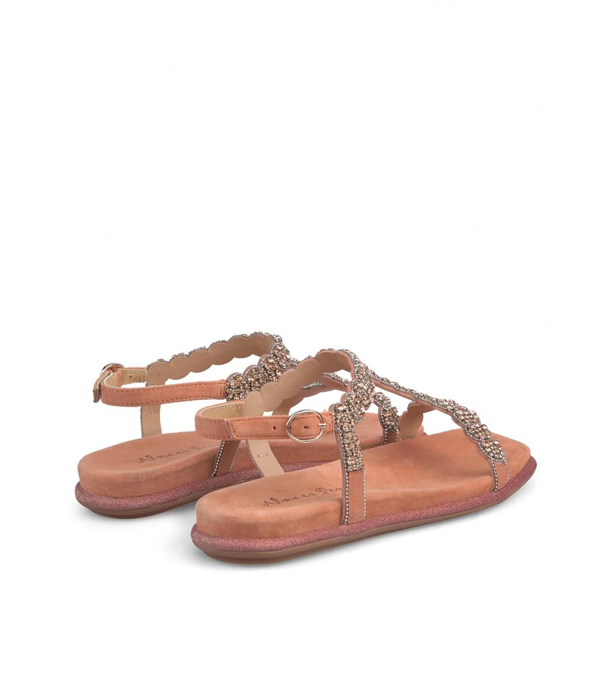 Sandalia plana de piel y punta cuadrada con pedrerÃa. Tira de pedrerÃa en delantero. Cierre con hebilla en tobillo y suela acolchada.
