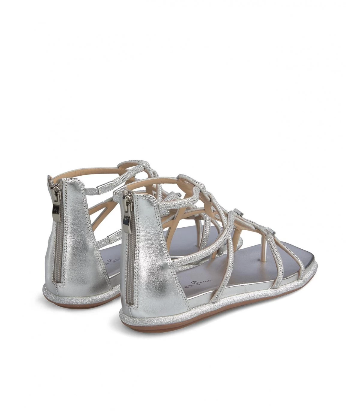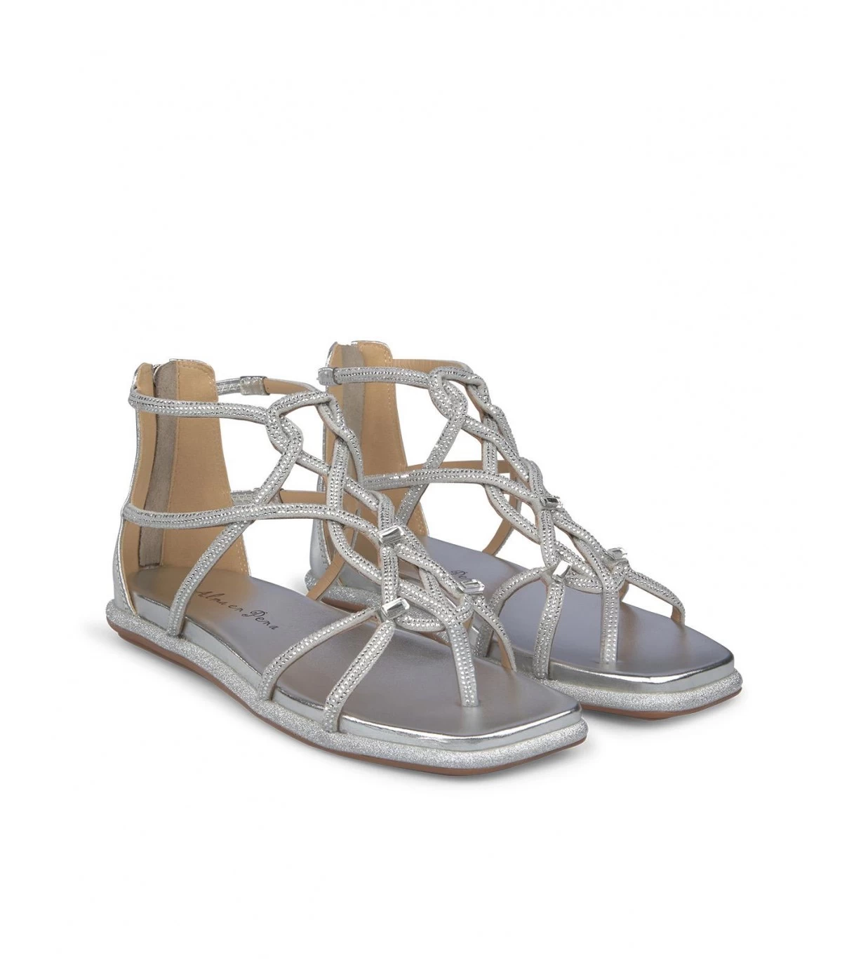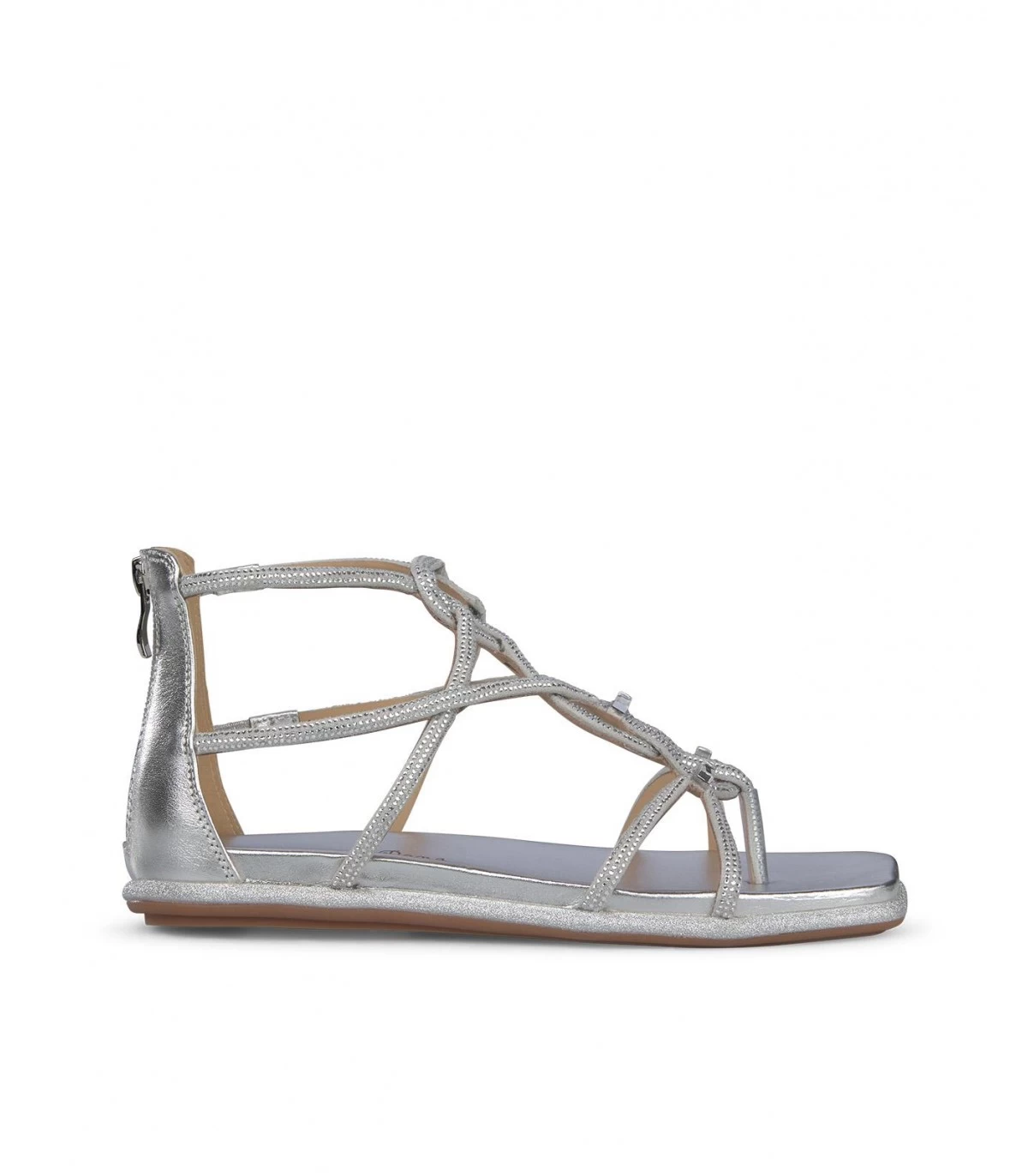 Sandalia plana de piel y punta cuadrada con pedrerÃa. Tiras de pedrerÃa cruzadas en delantero. Cierre con cremallera en talón y con suela acolchada.