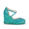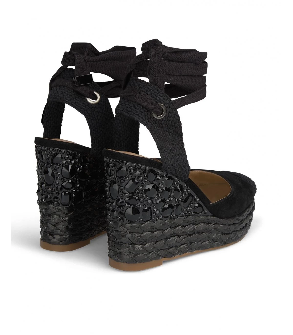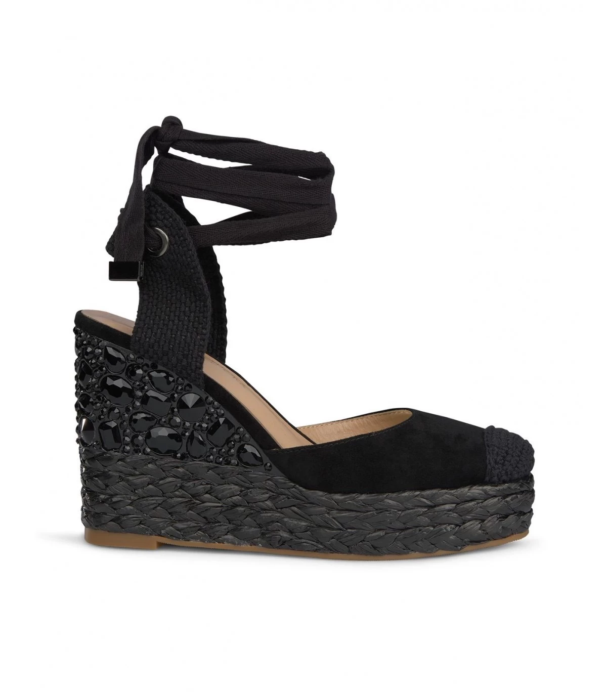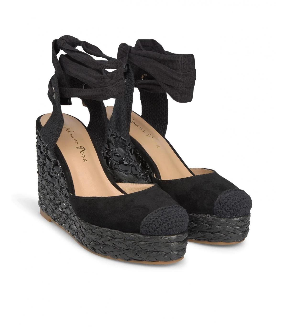 Sandalia cuña valenciana con detalle trenzado y detalle de pedrerÃa en tacón. Punta redondeada. Cierre con hebilla en tobillo. Altura de tacón de 11cm.