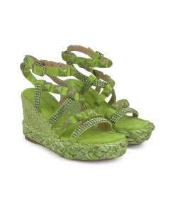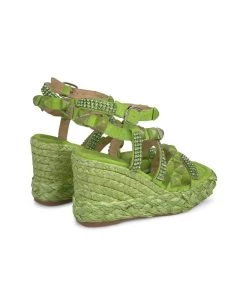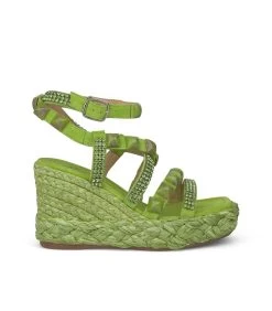 Sandalia cuña de piel trenzada y detalle de tiras cruzadas con pedrerÃa en delantero. Punta cuadrada y suela acolchada. Cierre con hebilla en tobillo. Altura de tacón de 9,5cm.