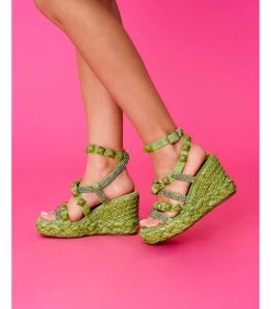 Sandalia cuña de piel trenzada y detalle de tiras cruzadas con pedrerÃa en delantero. Punta cuadrada y suela acolchada. Cierre con hebilla en tobillo. Altura de tacón de 9,5cm.