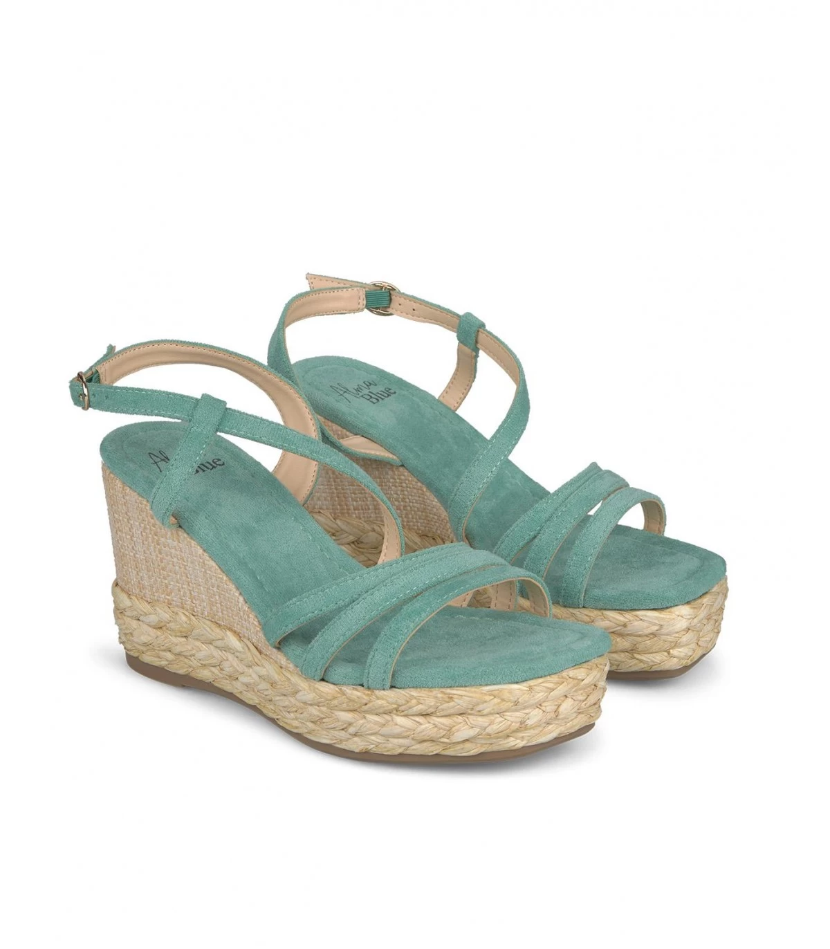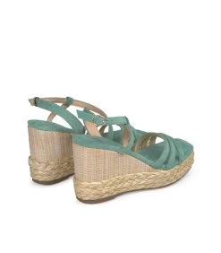 Sandalia tipo cuña con detalle de rafia combinada trenzada. Plantilla acolchada para un máximo confort. Cierre de hebilla ajustable. Altura del tacón 9,5cm.