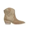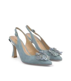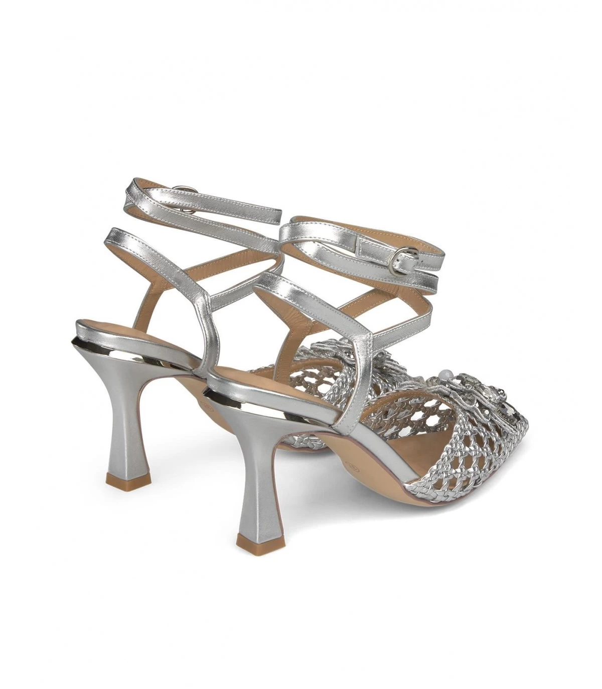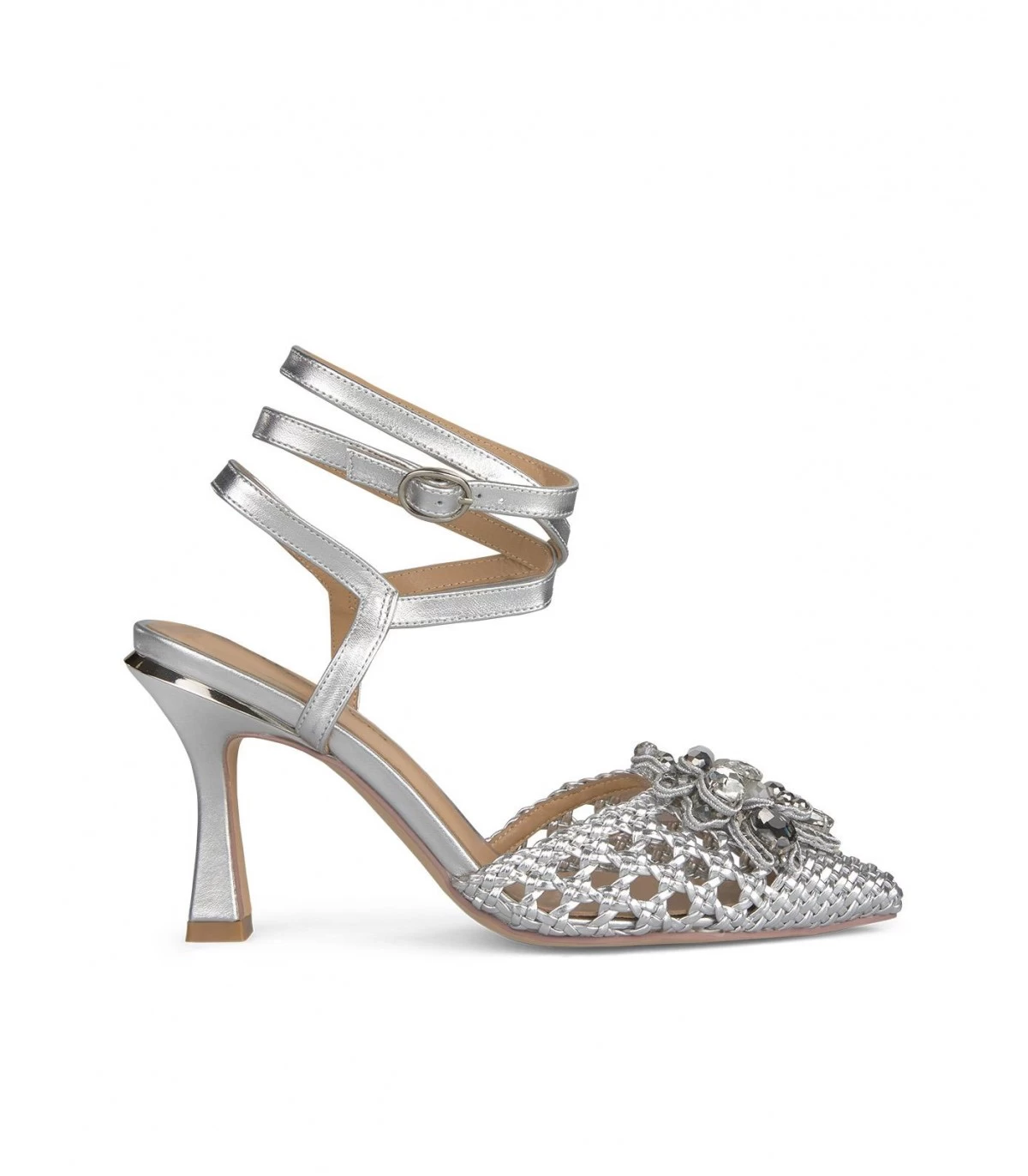 Salón de piel destalonado troquelado con detalle de pedrerÃa en la puntera y cierre de tiras cruzadas. Plantilla acolchada de piel. La altura del tacón es de 9cm.
