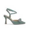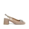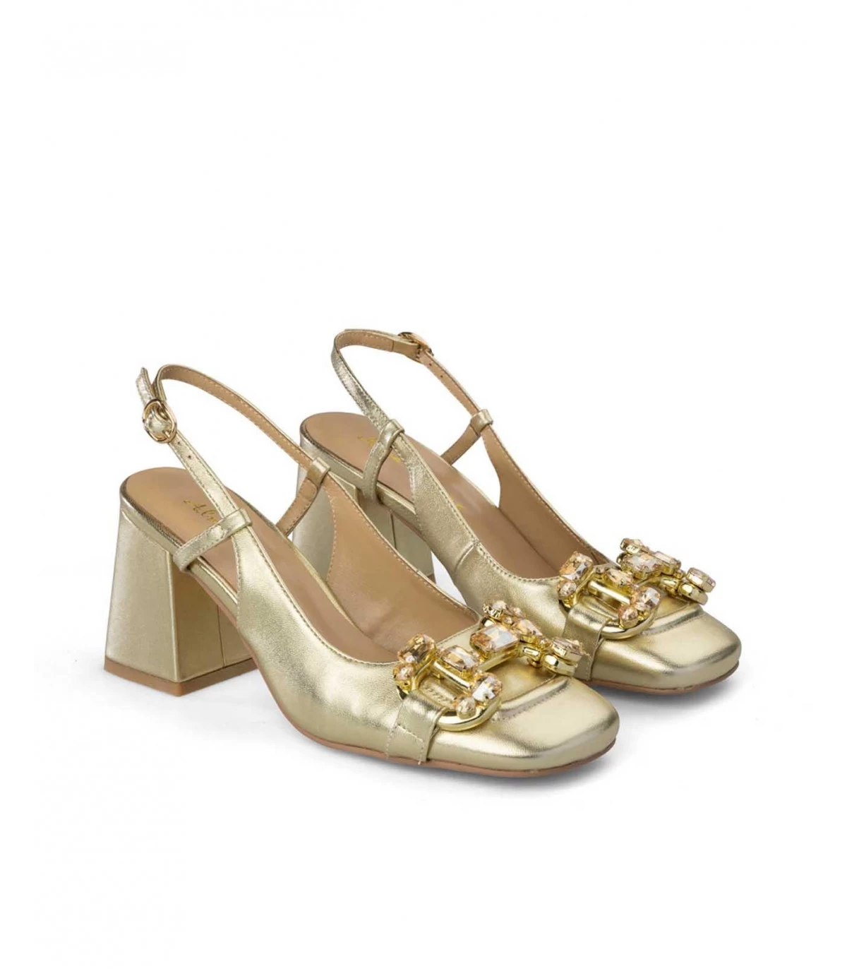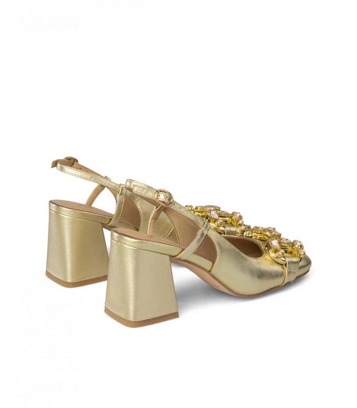 Zapato de tacón de piel destalonado con detalle de pedrerÃa en la puntera y cierre con hebilla. Plantilla acolchada de piel. La altura del tacón es de 8cm.