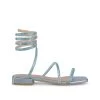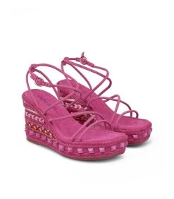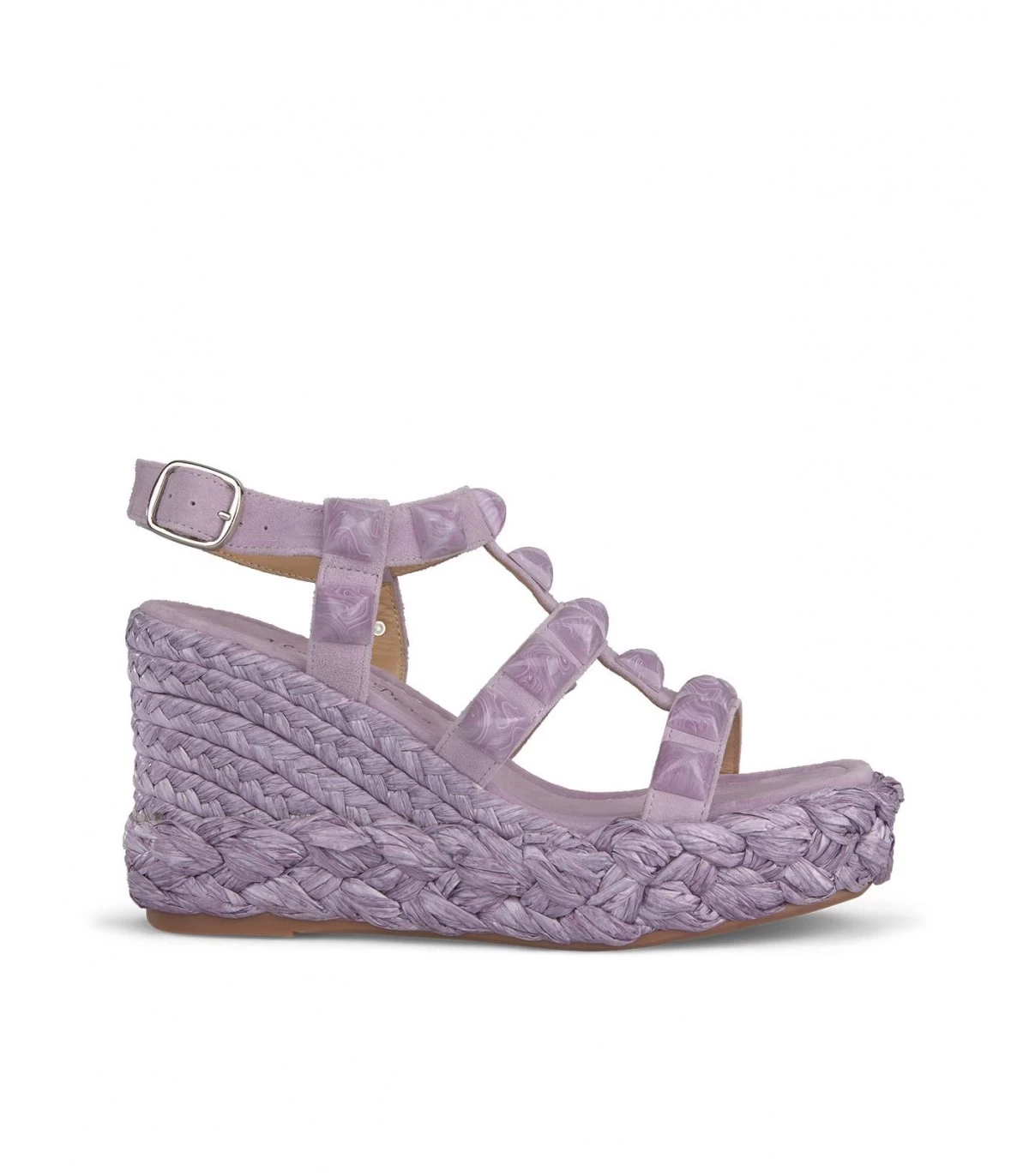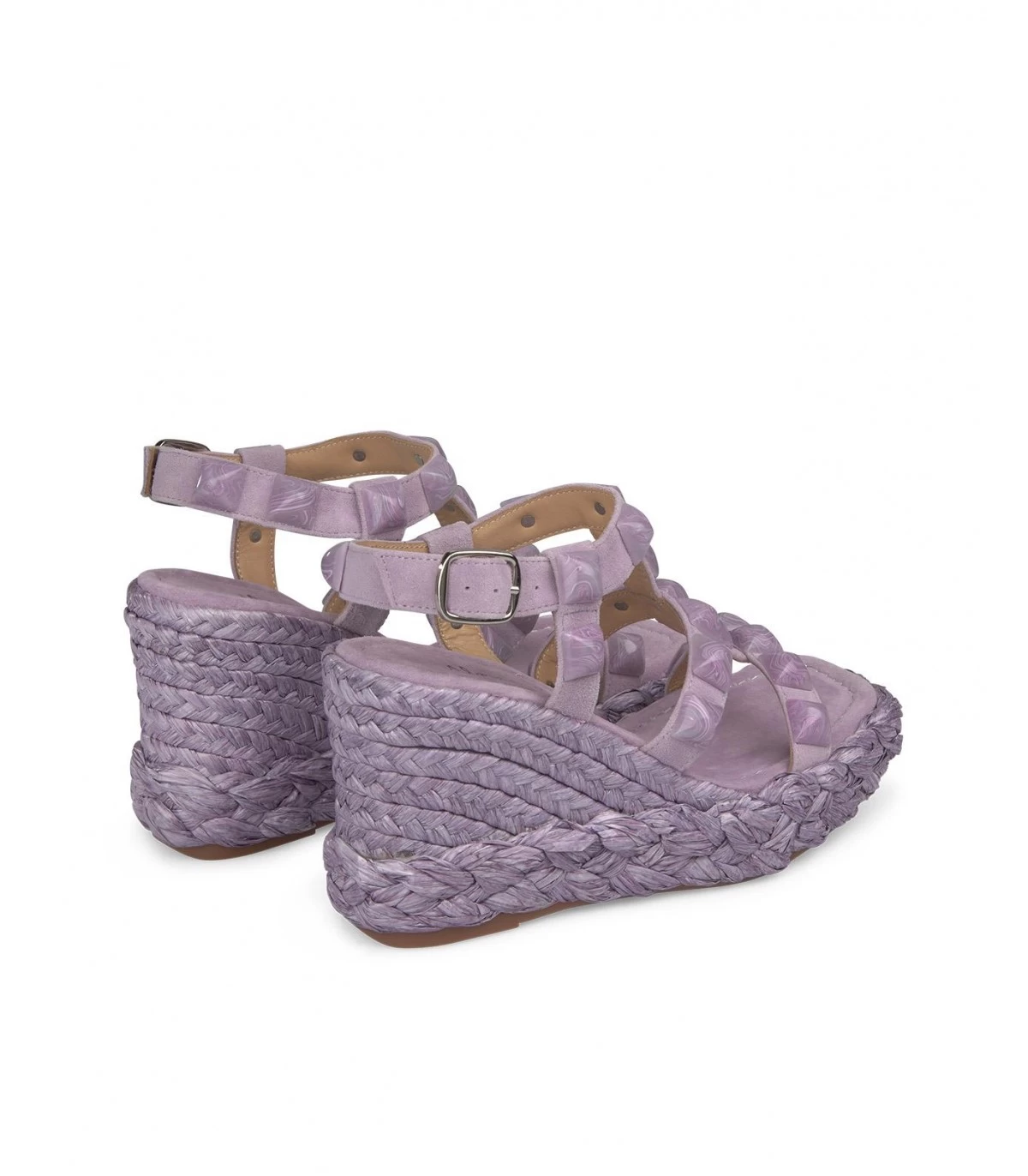 Sandalia cuña de piel trenzada y detalle de tiras con pedrería en delantero. Punta cuadrada y suela acolchada. Cierre con hebilla en tobillo. Altura de tacón de 9,5cm.