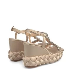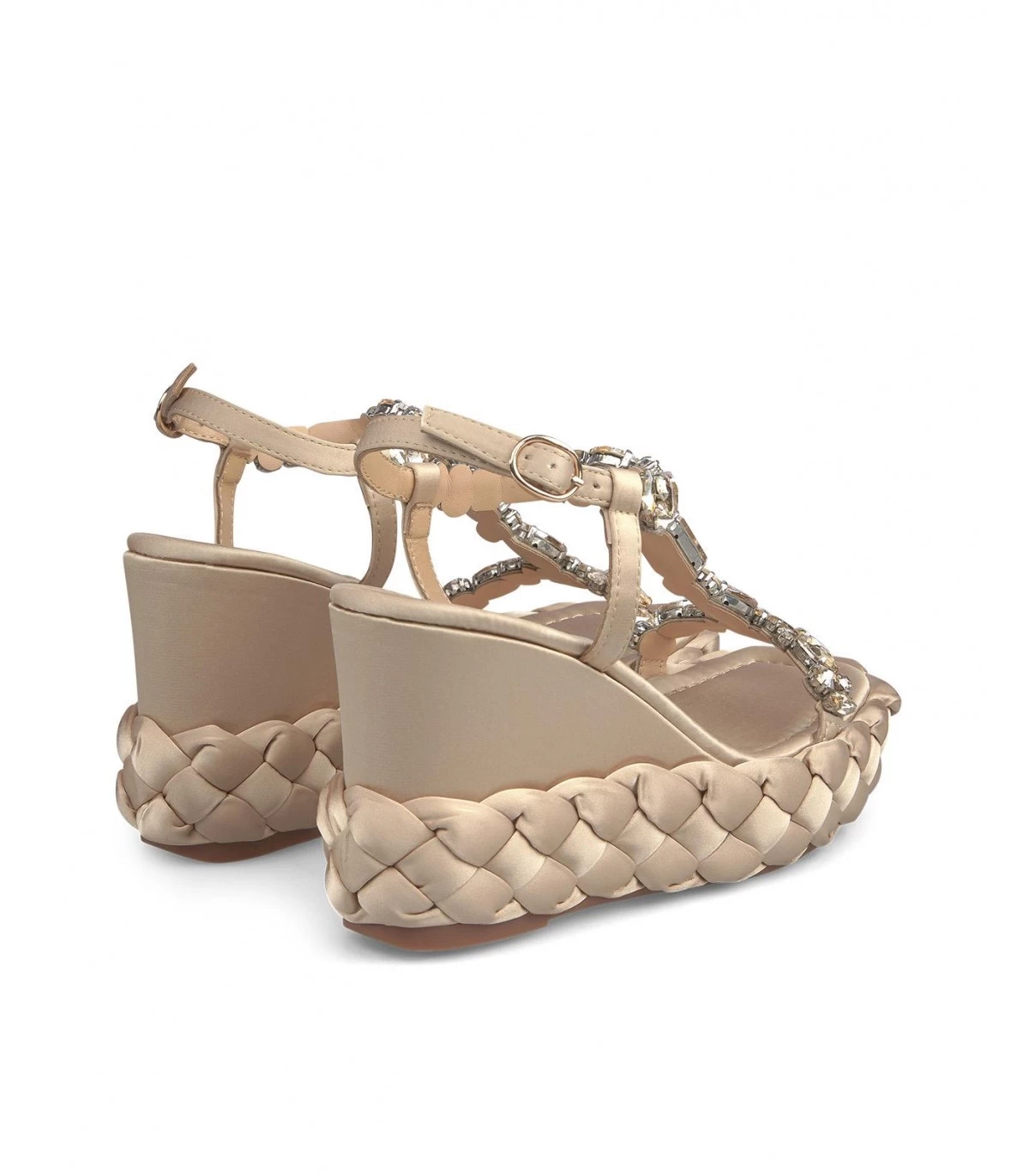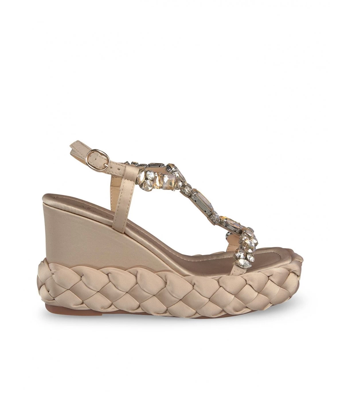 Sandalia cuña trenzada de satén, tiras cubiertas de pedrerÃa. Punta cuadrada y suela acolchada. Cierre con hebilla en tobillo. Altura de tacón de 9,5cm.