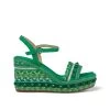 Sandalia con cuña baja de piel y punta cuadrada. Tiras cubiertas de pedrería. Cierre con hebilla en tobillo y con suela acolchada. Altura del tacón de 4cm