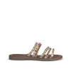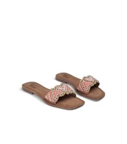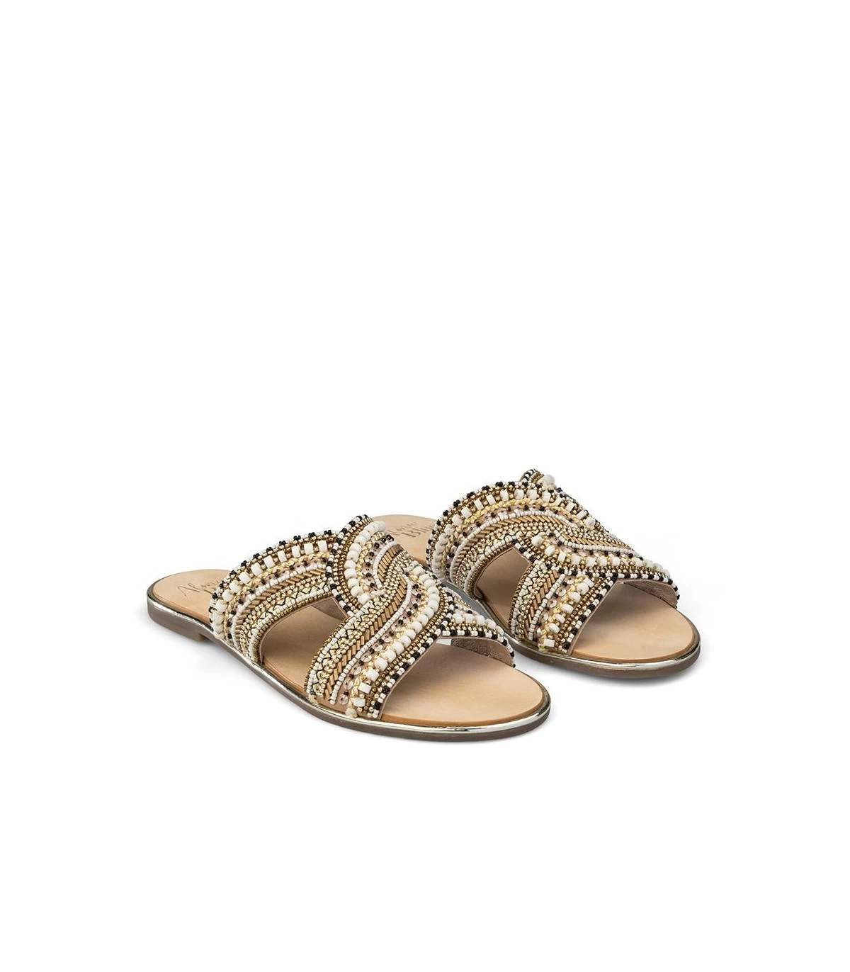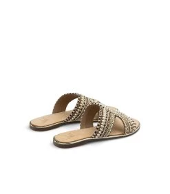 Sandalia plana con tiras cruzadas de pedrerÃa. Plantilla acolchada para un mayor confort. La altura del tacón es de 1cm.