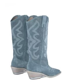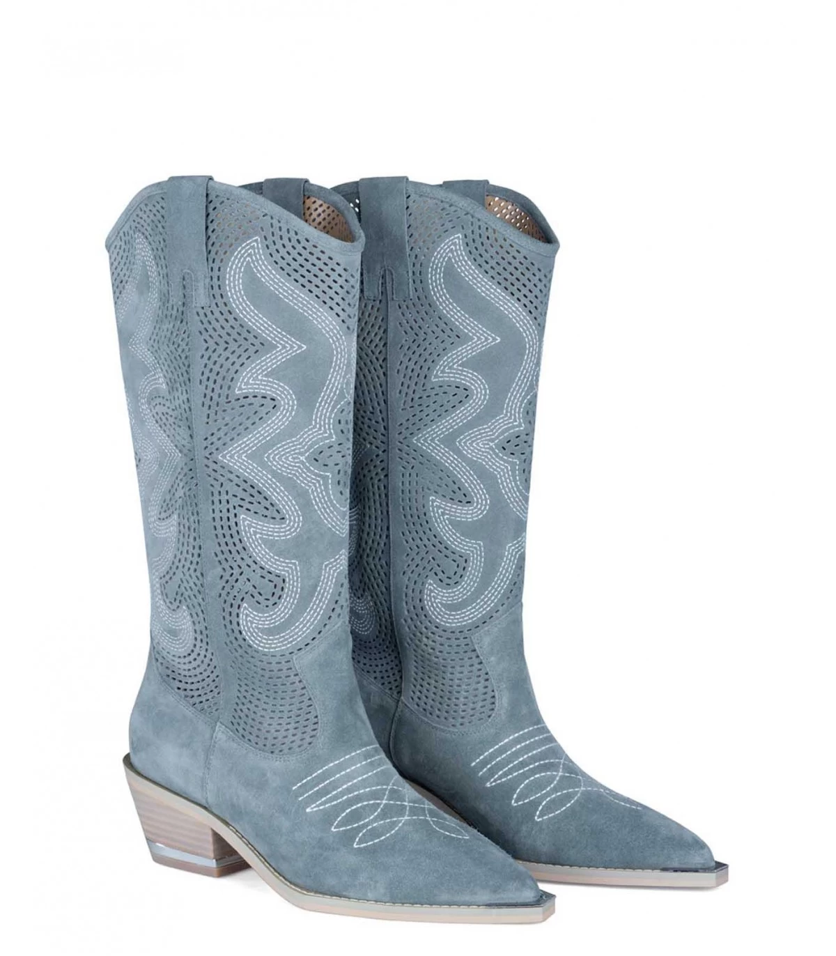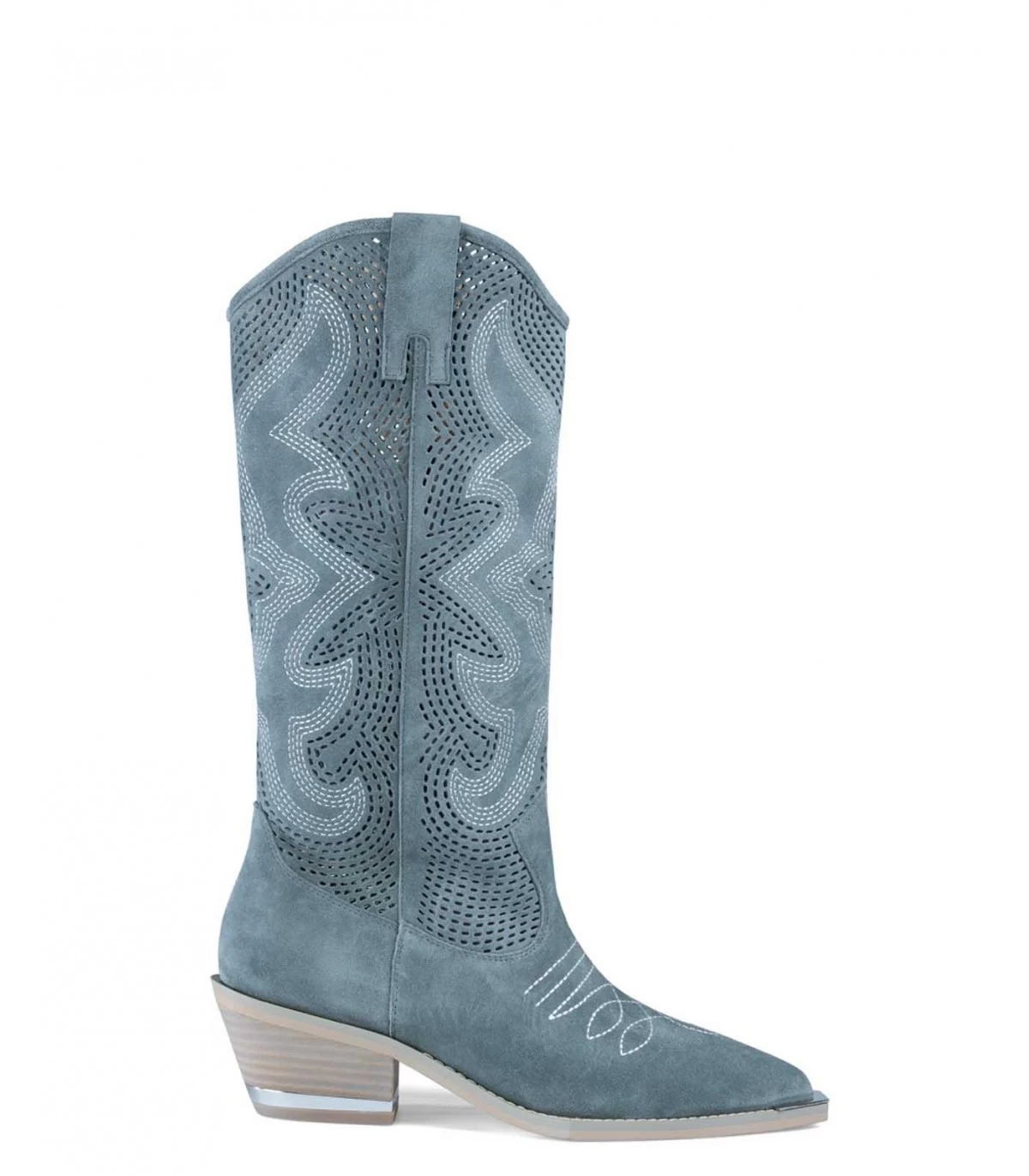 Bota de piel con la caña troquelada y costura contraste. El contorno de la abertura es de 32cm, la altura del tacón es de 6cm y la altura de la caña es de 25cm. Plantilla acolchada de piel.