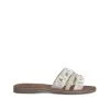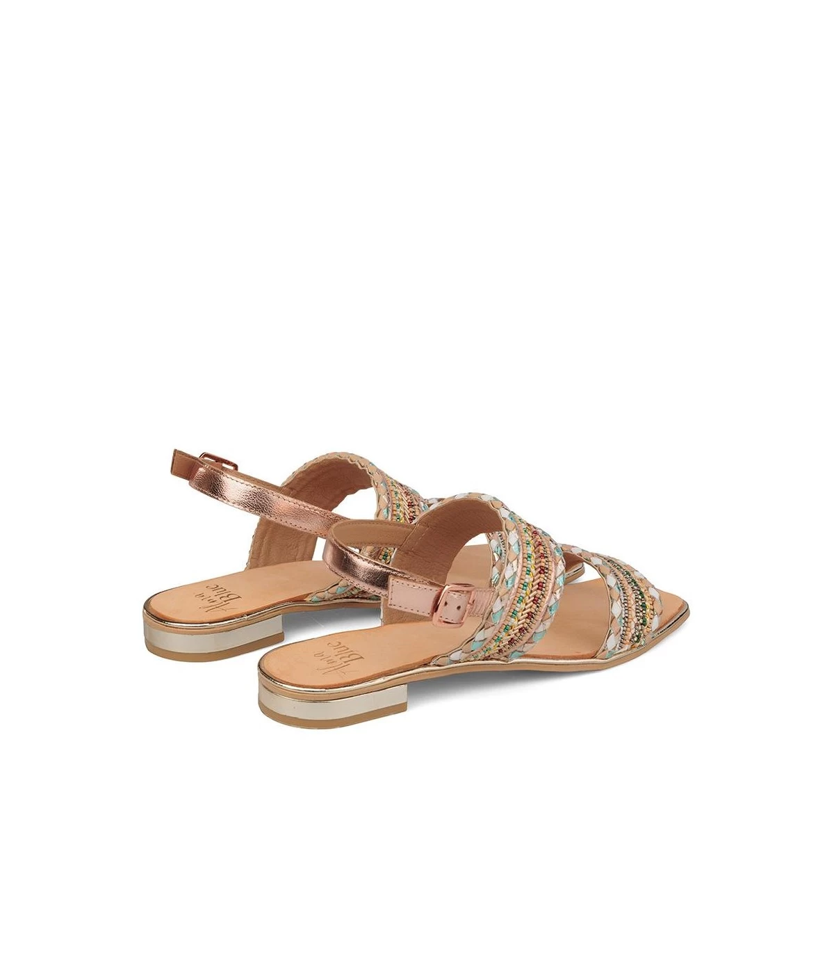 Sandalia plana con tiras de pedrerÃa y trenzados multicolor. Plantilla acolchada para un mayor confort. La altura del tacón es de 1cm.