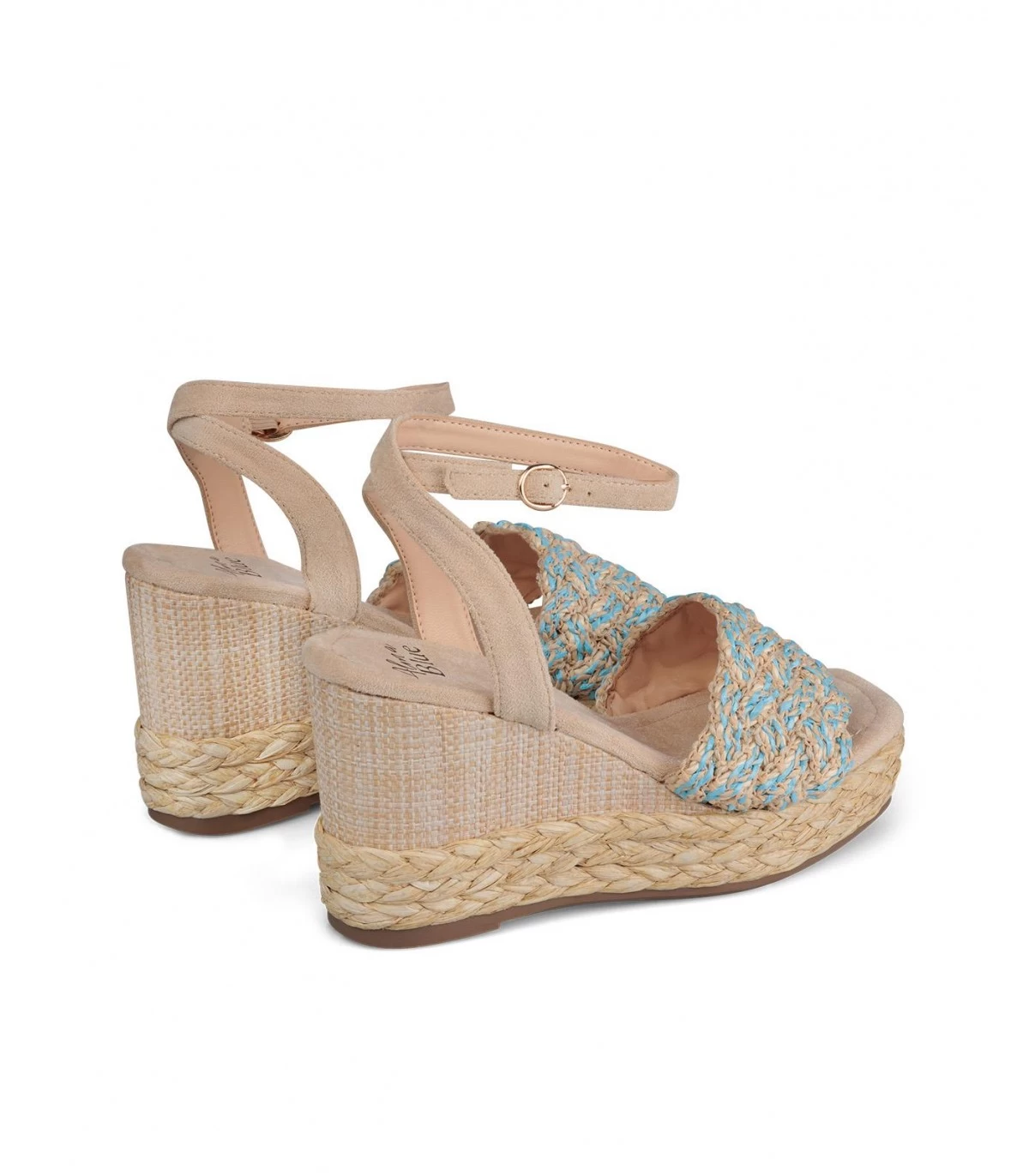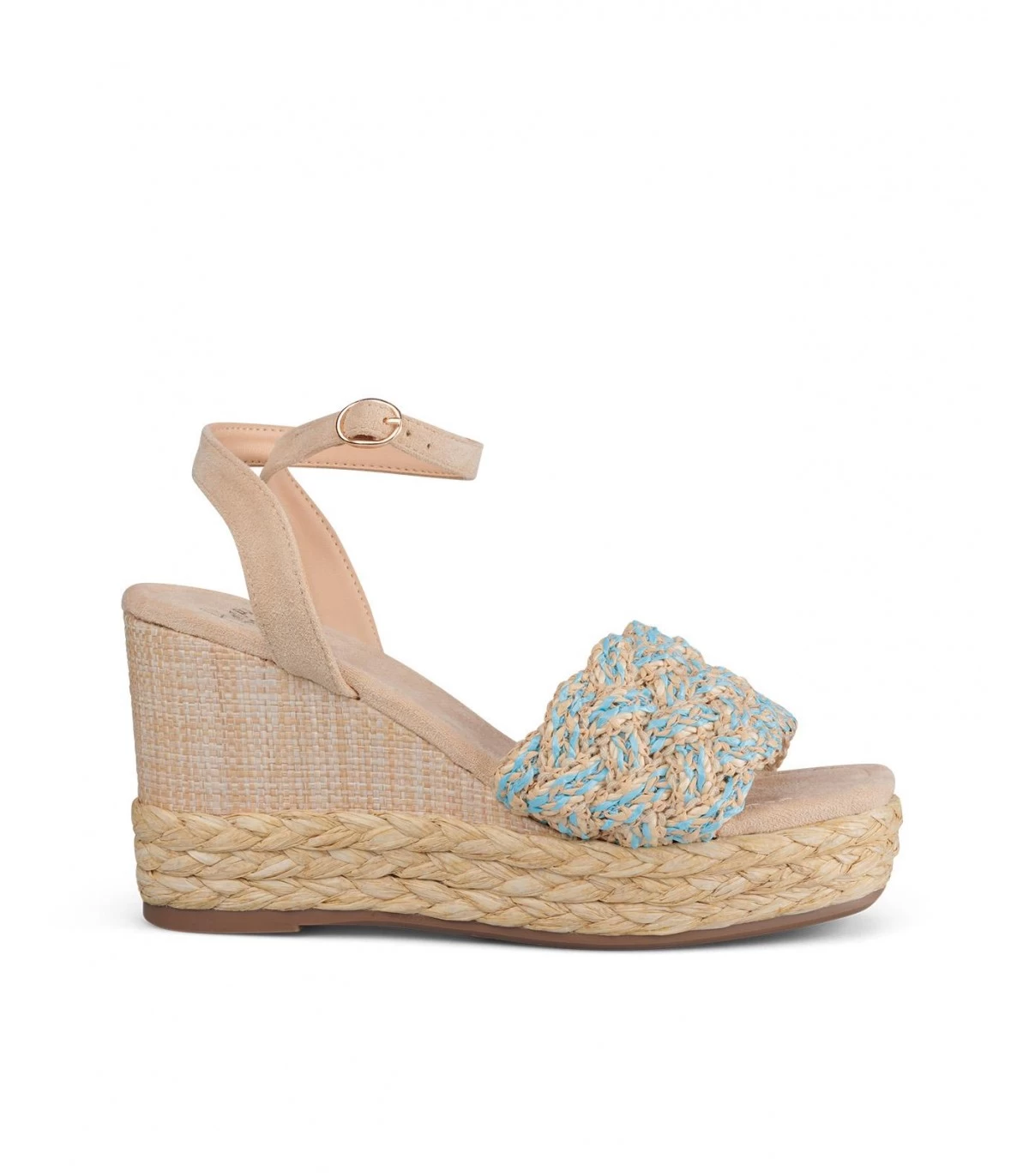 Sandalia tipo cuña con tira de rafia trenzada bicolor. Plantilla acolchada para un mayor confort. La altura del tacón es de 9,5cm.