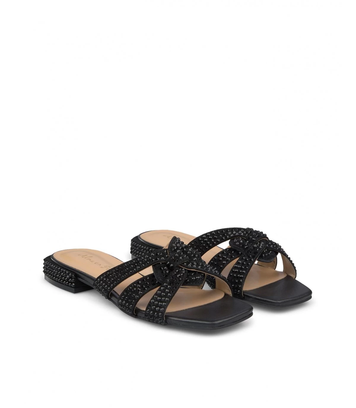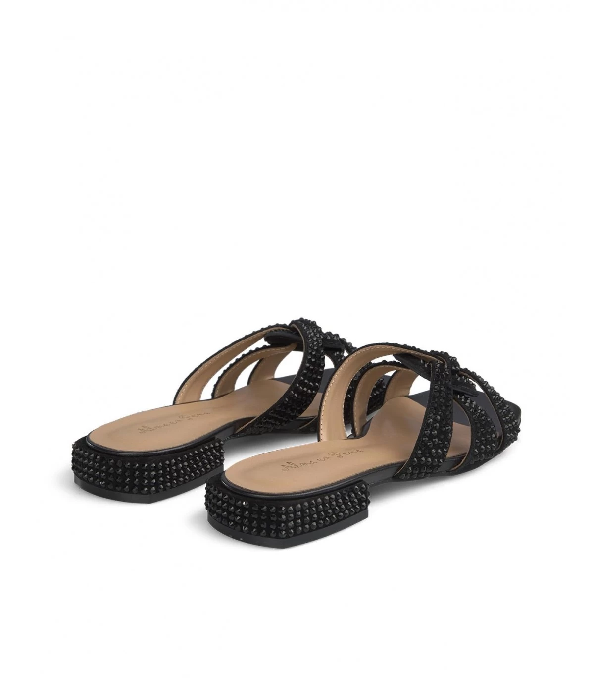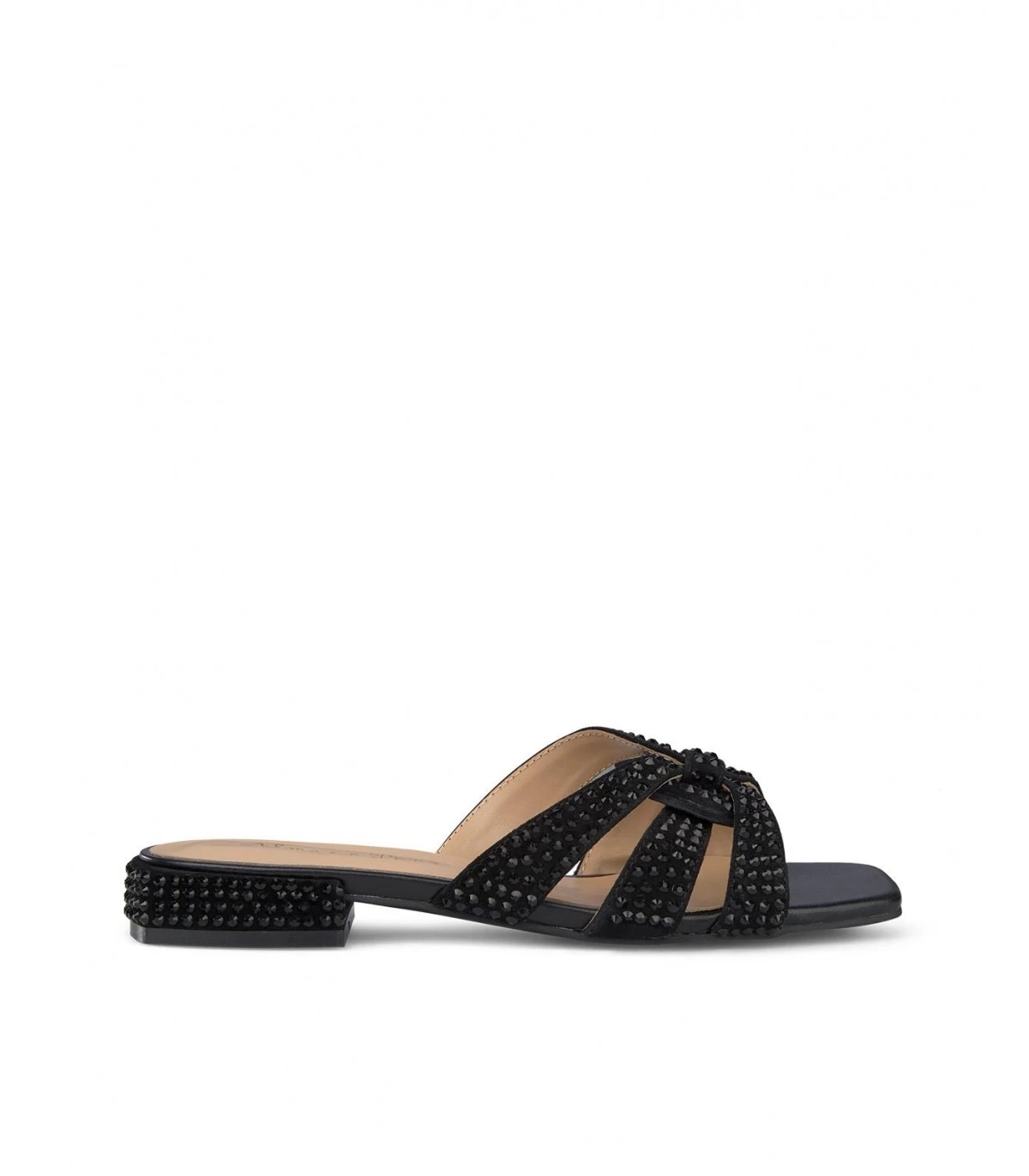 Sandalia plana de piel con tiras y tacón cubiertos de pedrerÃa. Plantilla acolchada de piel. La altura del tacón es de 1cm.