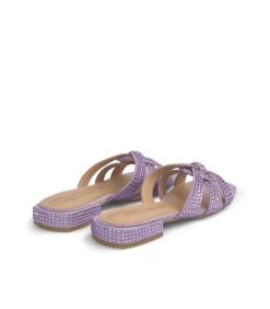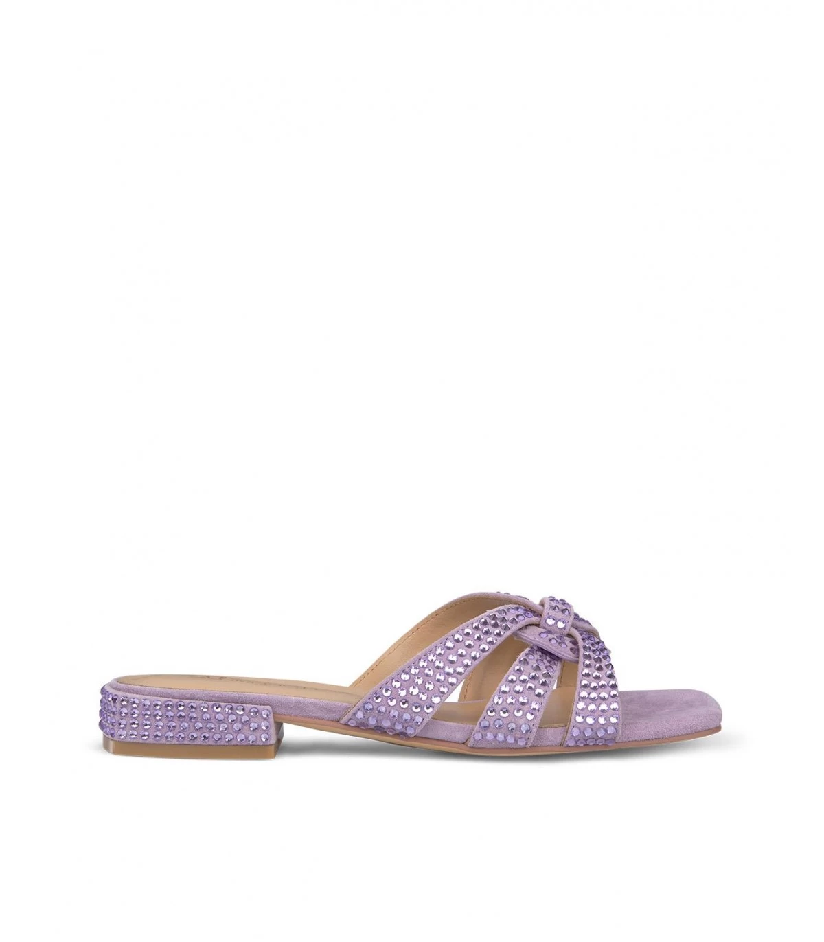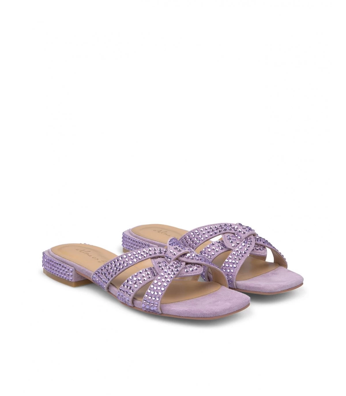 Sandalia plana de piel con tiras y tacón cubiertos de pedrerÃa. Plantilla acolchada de piel. La altura del tacón es de 1cm.