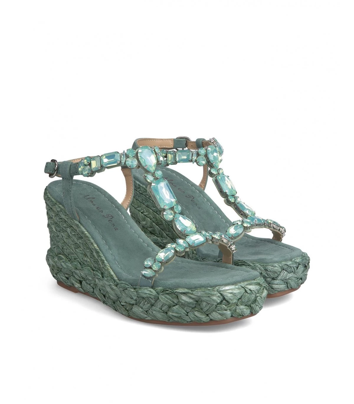 Sandalia cuña de piel con detalle trenzado y de pedrería en delantero. Punta cuadrada. Cierre con hebilla en tobillo. Altura de tacón de 9,5cm.