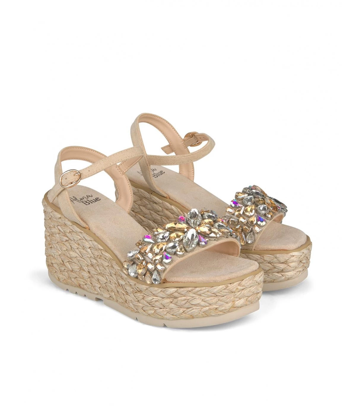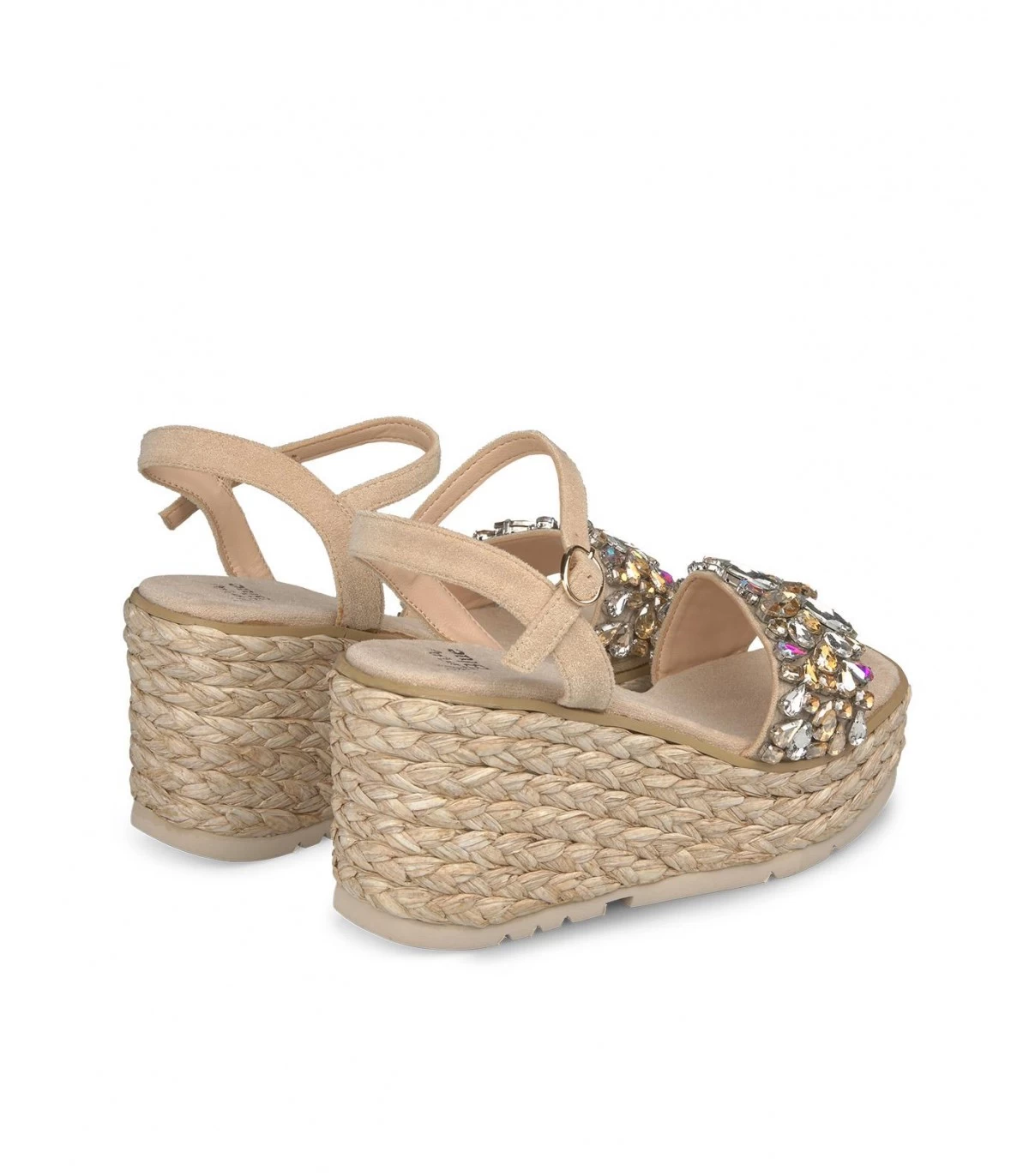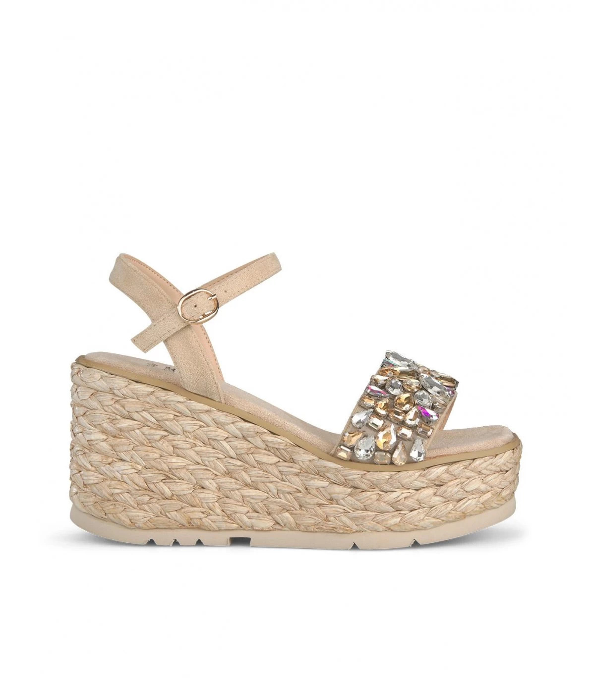 Sandalia tipo cuña con tira de pedrerÃa. Plantilla acolchada para un mayor confort. La altura del tacón es de 9,5cm.
