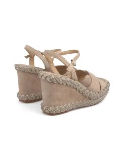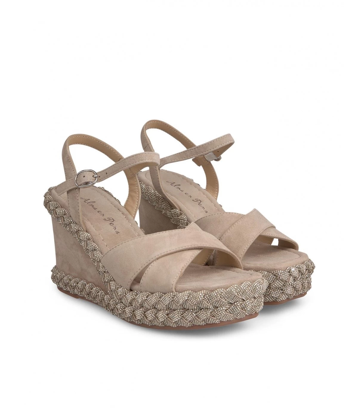 Sandalia cuña de piel con adorno trenzado. Plantilla de piel acolchada para un mayor confort. La altura del tacón es de 9,5cm.