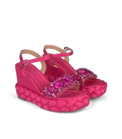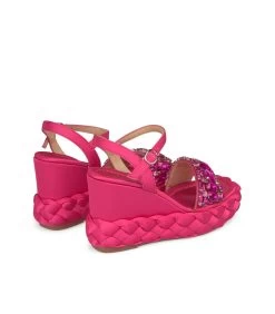 Sandalia cuña trenzada de satén, detalle de tira de pedrerÃa en delantero. Punta cuadrada y suela acolchada. Cierre con hebilla en tobillo. Altura de tacón de 9,5cm.