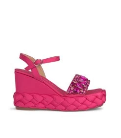 Sandalia cuña trenzada de satén, detalle de tira de pedrerÃa en delantero. Punta cuadrada y suela acolchada. Cierre con hebilla en tobillo. Altura de tacón de 9,5cm.