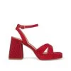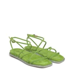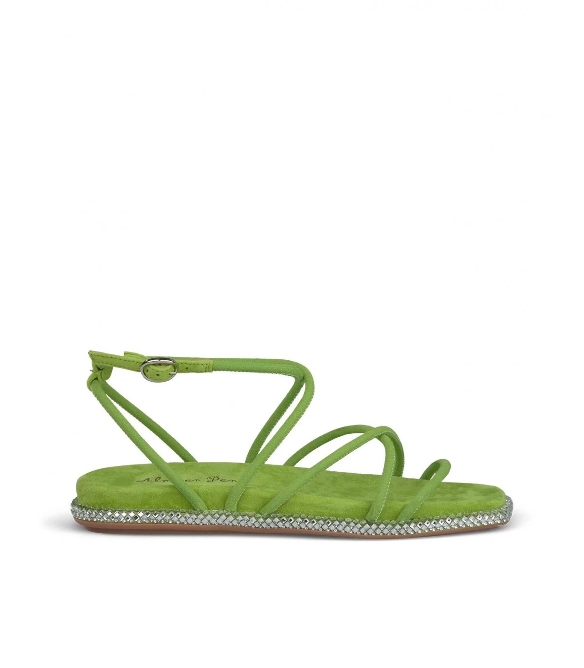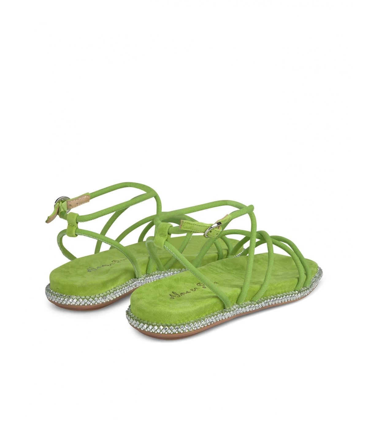 Sandalia plana de piel y punta cuadrada con pedrerÃa. Tiras cruzadas en delantero. Cierre con hebilla en tobillo y suela acolchada.