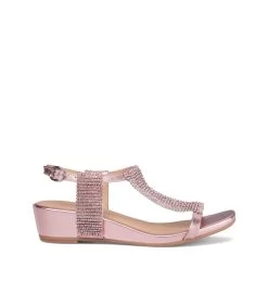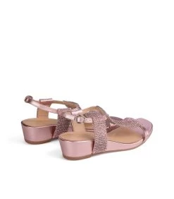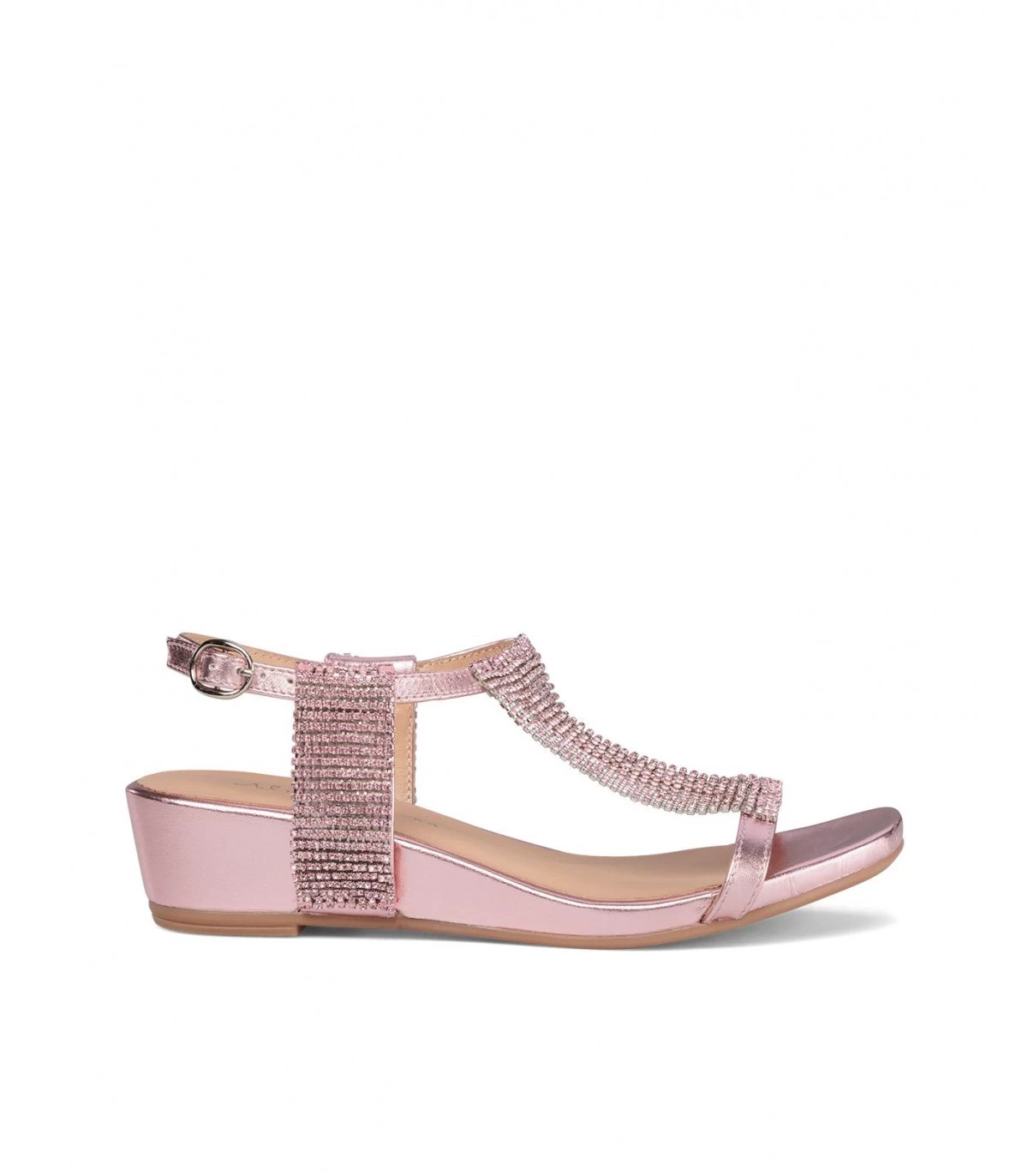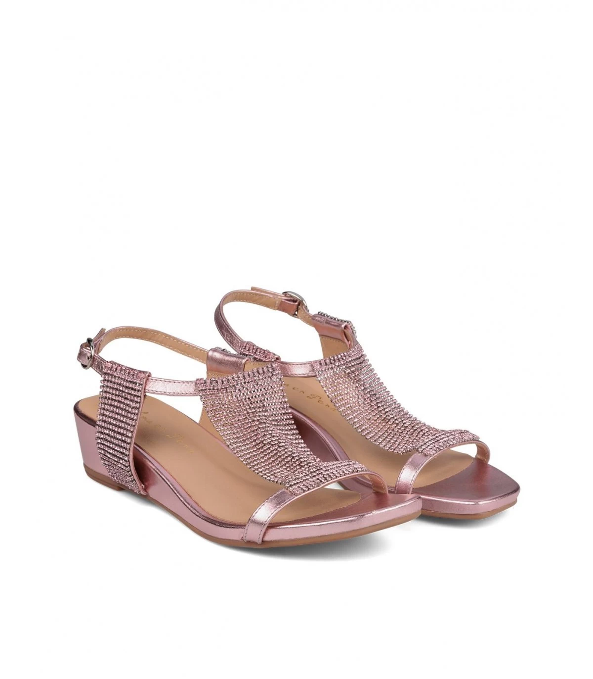 Sandalia con cuña baja y punta cuadrada. Detalle de pedrería en delantero. Cierre con hebilla en tobillo. Cuña de piel con suela acolchada. Altura del tacón de 4cm