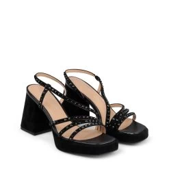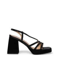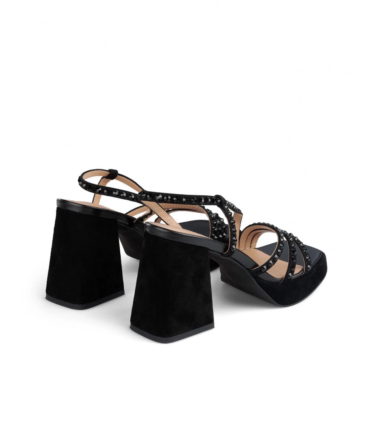 Sandalia de tacón con plataforma realizada en piel con tiras delanteras de pedrerÃa. Plantilla acolchada de piel. La altura del tacón son 9cm.