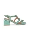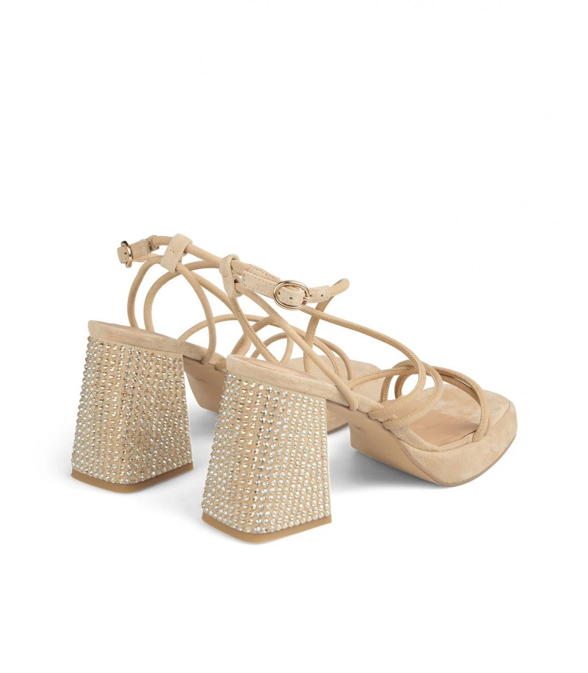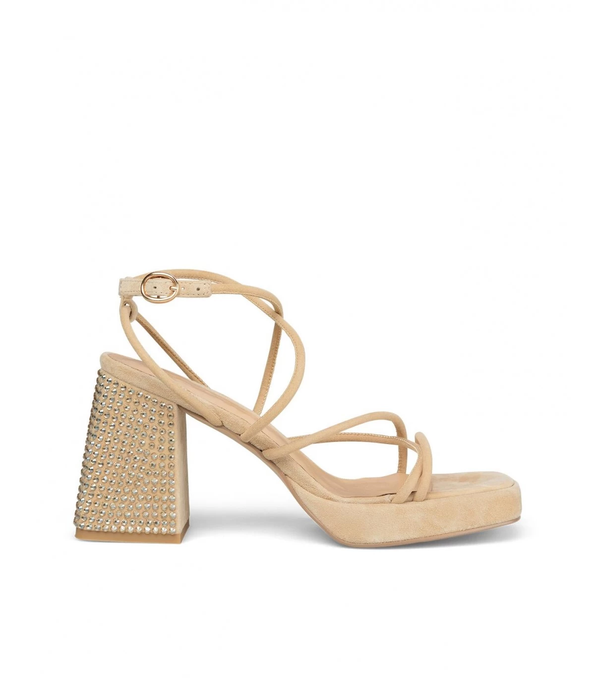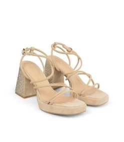 Sandalia de tacón con plataforma realizada en piel con tiras entrelazadas hasta el tobillo de pedrerÃa. Cierre ajustable de hebilla. Plantilla acolchada de piel. La altura del tacón son 9cm.