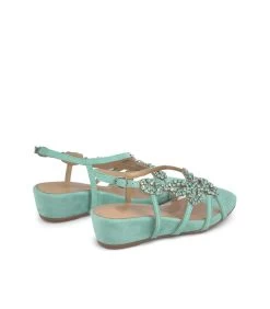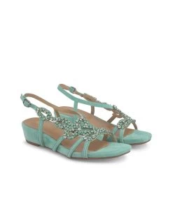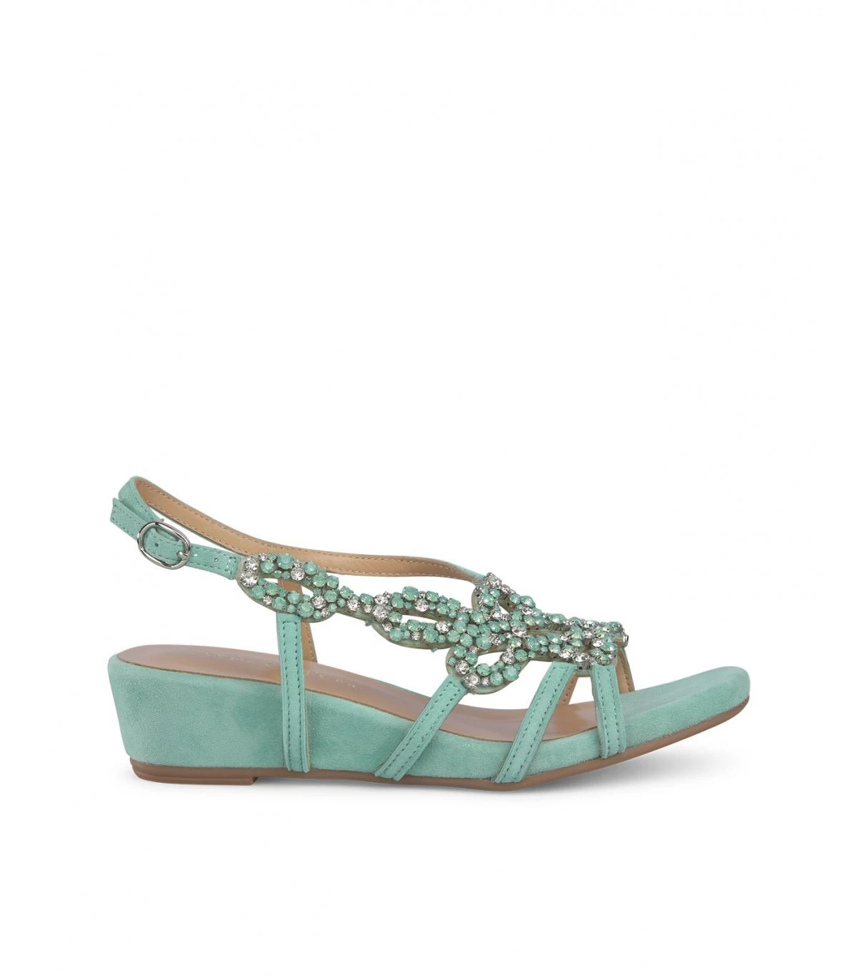 Sandalia con cuña baja de piel y punta cuadrada. Detalle de pedrerÃa en delantero. Cierre con hebilla en tobillo y con suela acolchada. Altura del tacón de 4cm