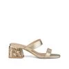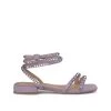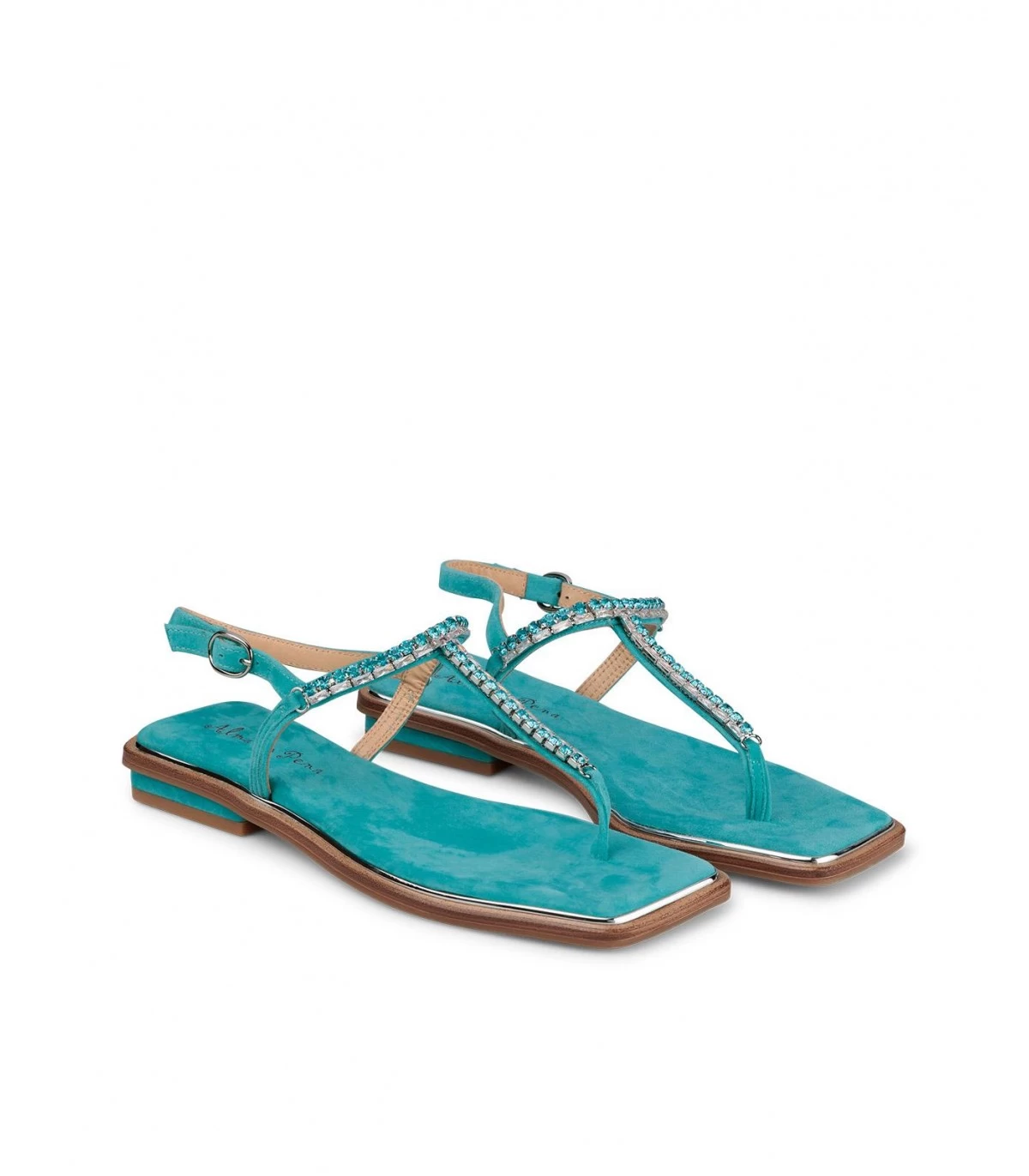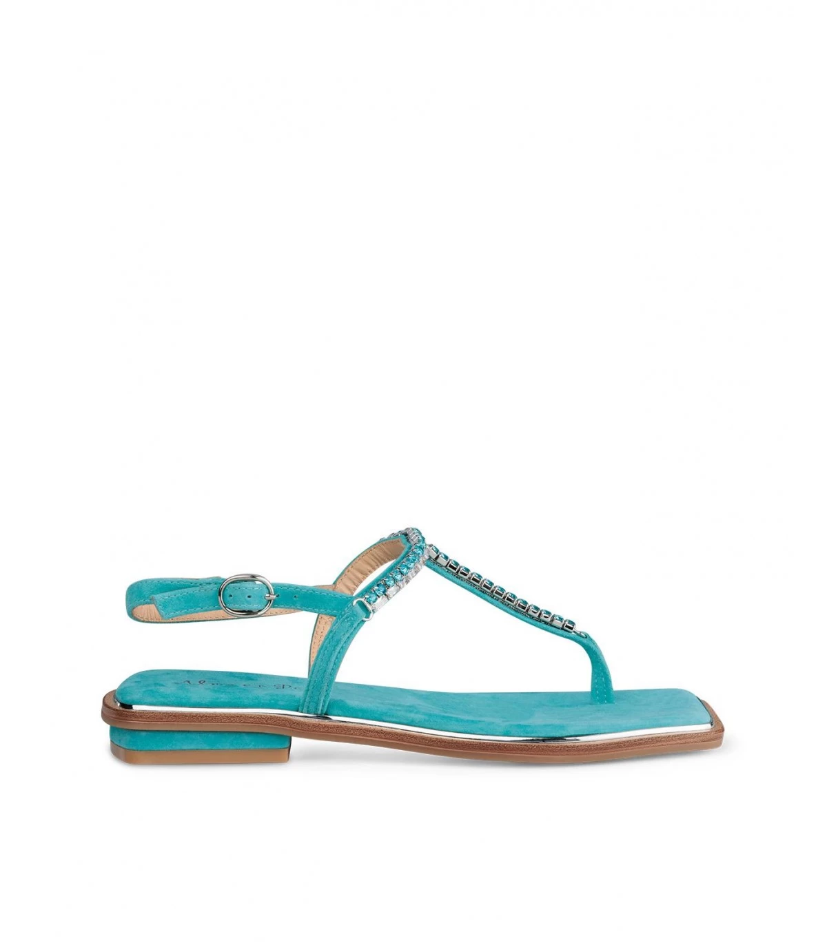 Sandalia plana de piel con tiras cubiertas de pedrerÃa. Cierre con hebilla ajustable. Plantilla acolchada de piel. La altura del tacón es de 1cm.