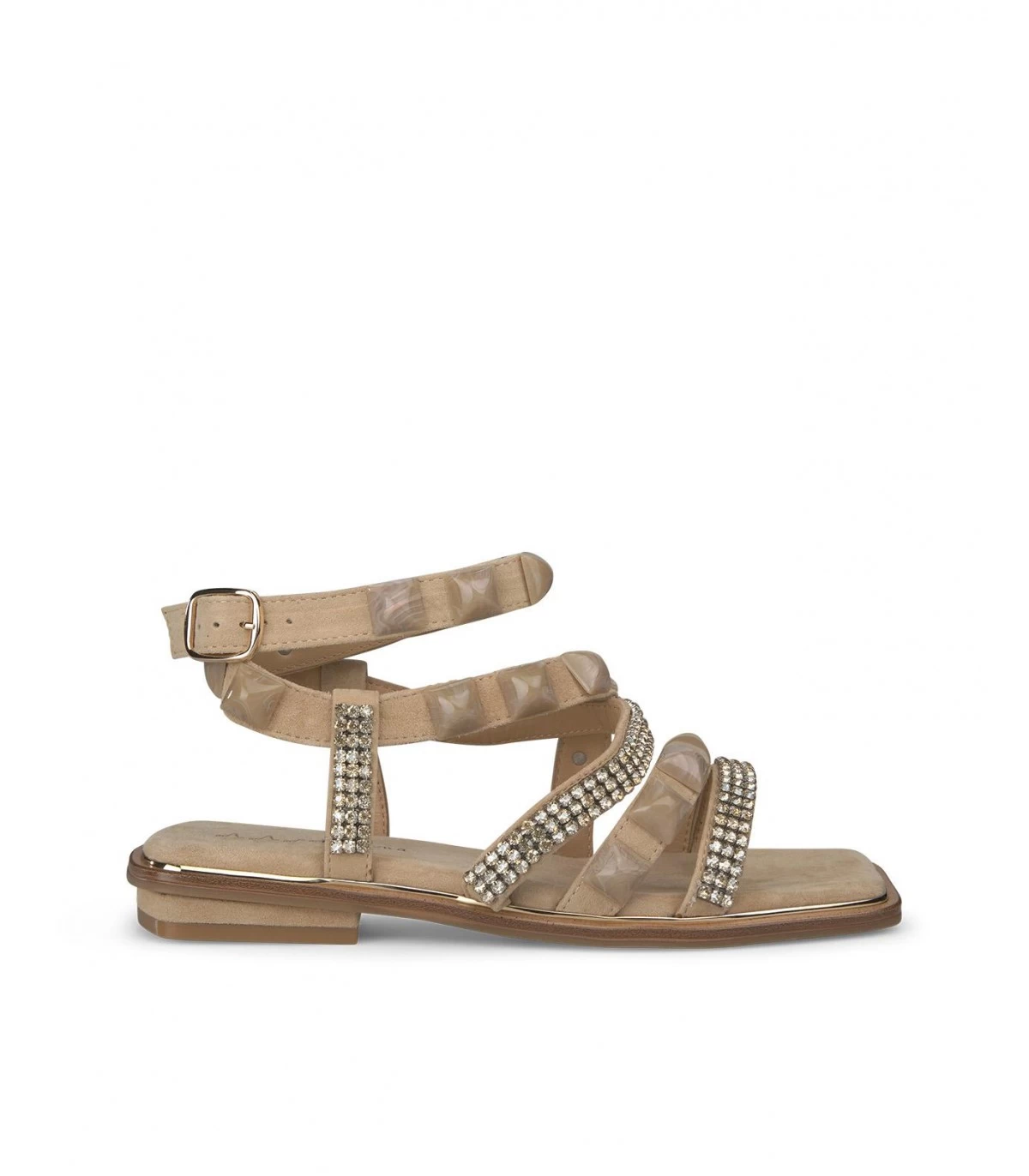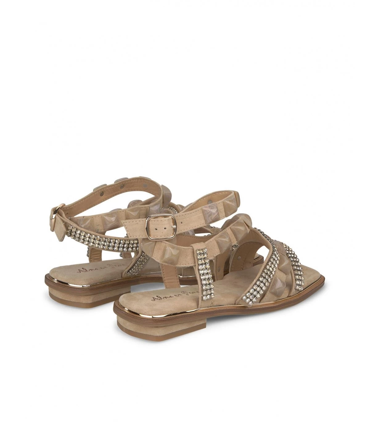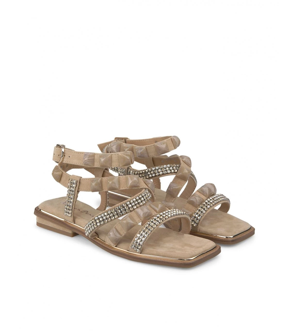 Sandalia plana de piel con tiras cubiertas de pedrerÃa. Plantilla acolchada de piel. La altura del tacón es de 1cm.