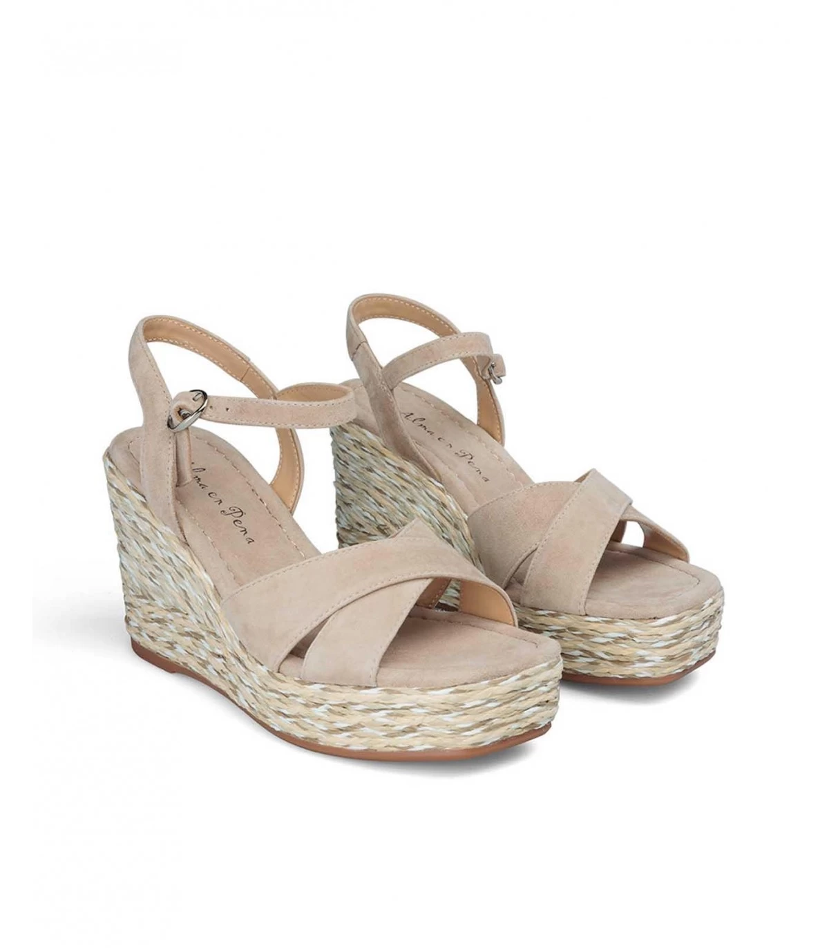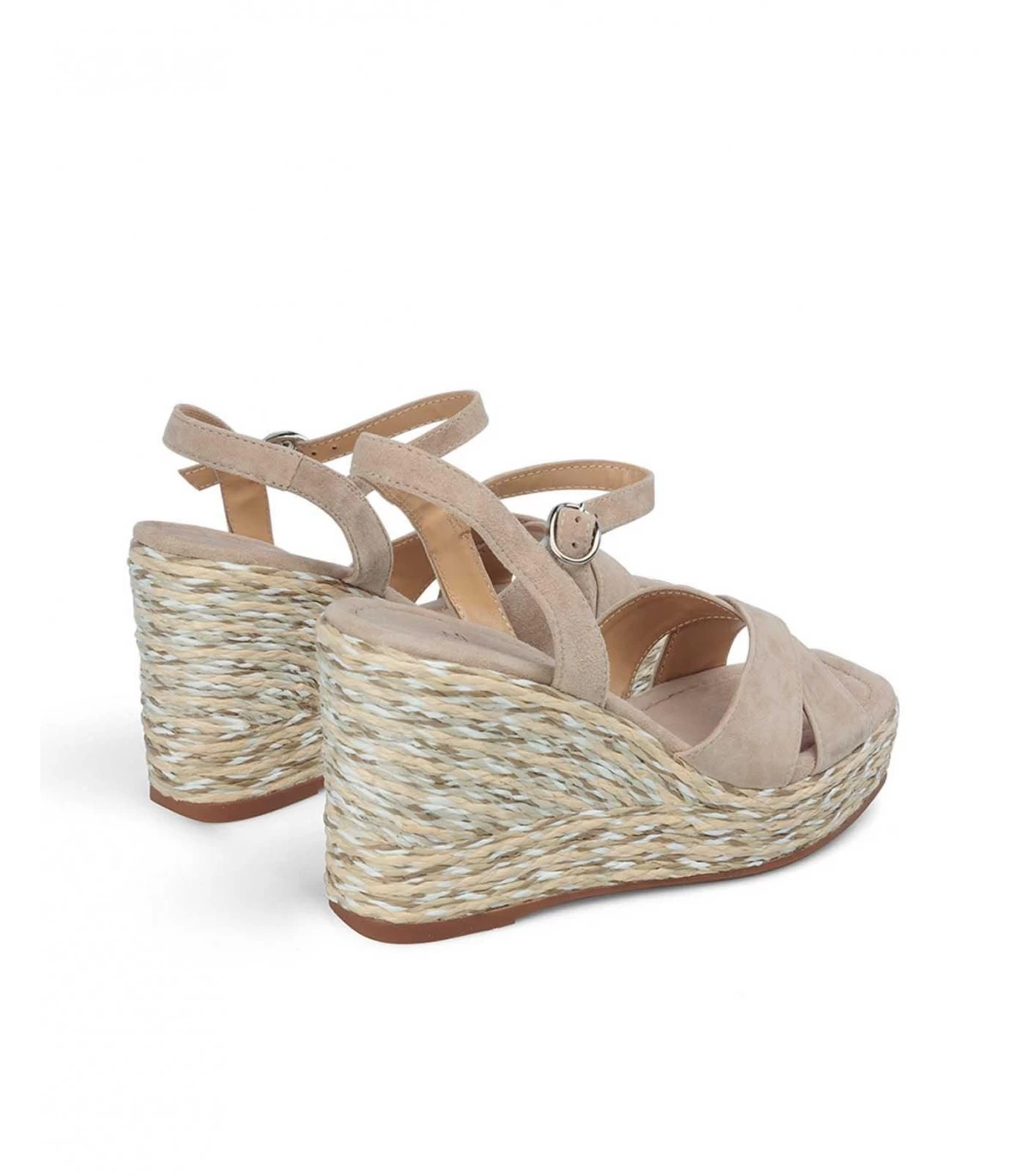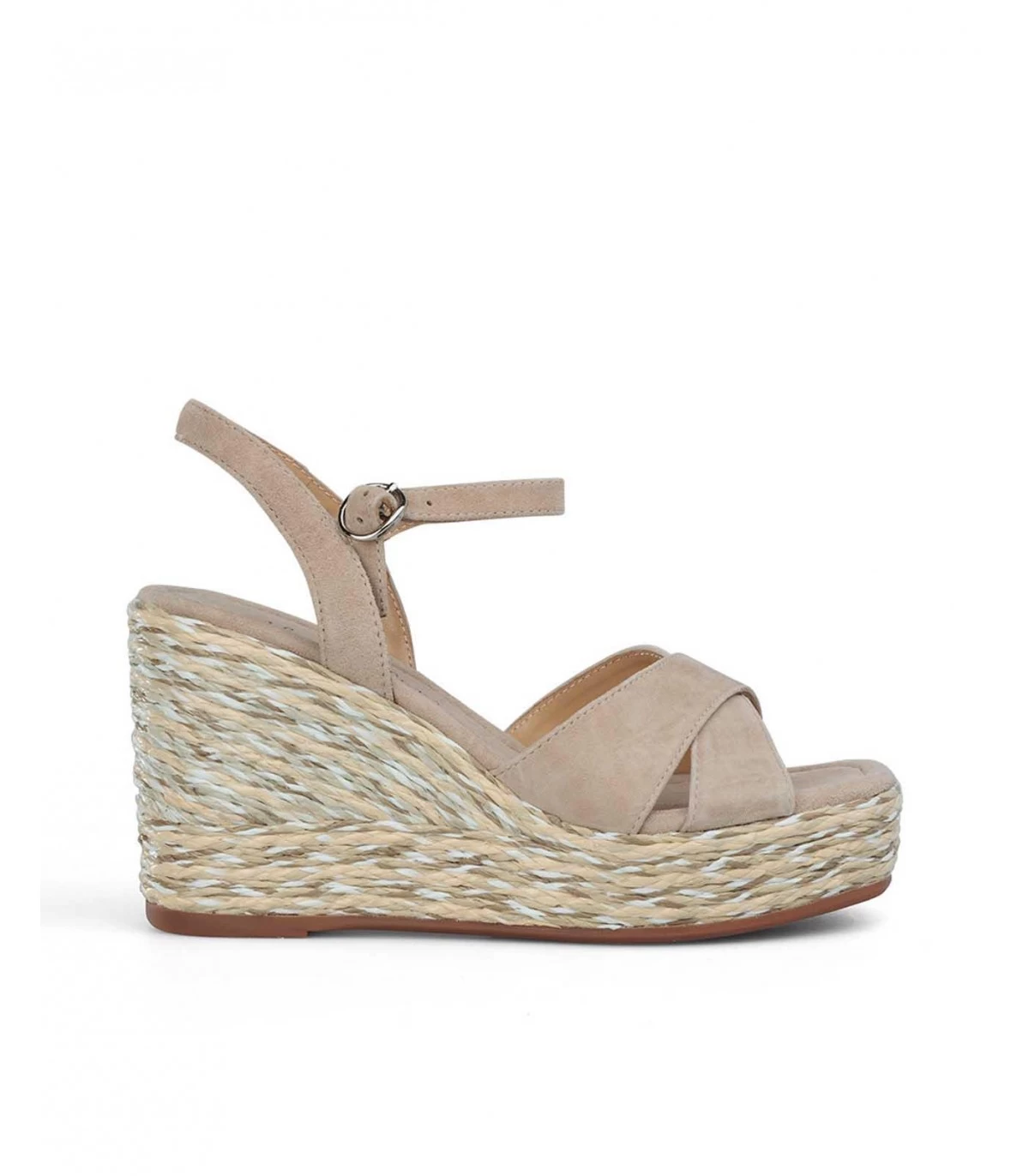 Sandalia cuña de piel de rafia con tiras de piel cruzadas. Plantilla acolchada de piel para un mayor confort. La altura del tacón es de 9,5cm.