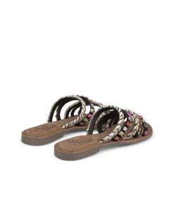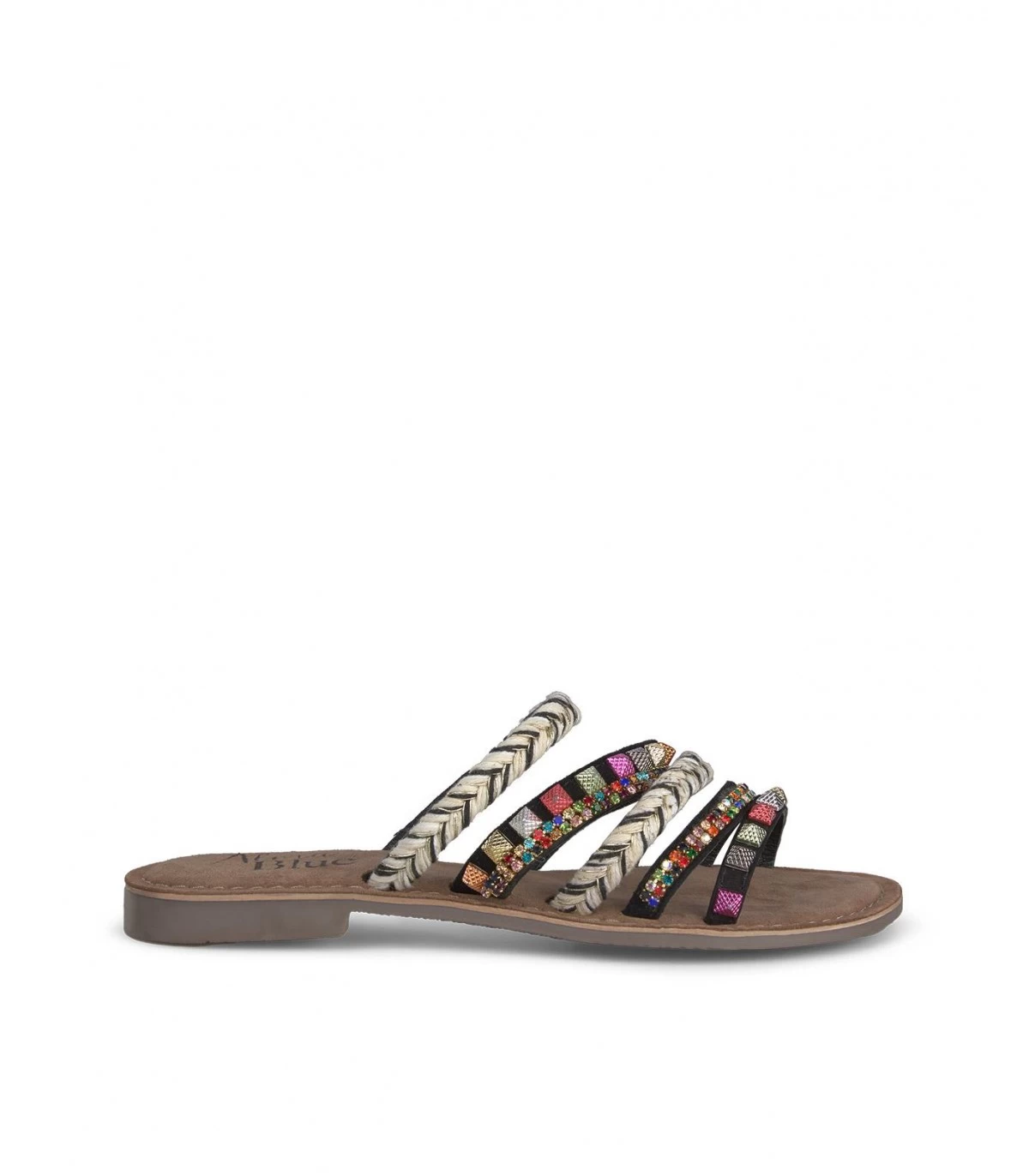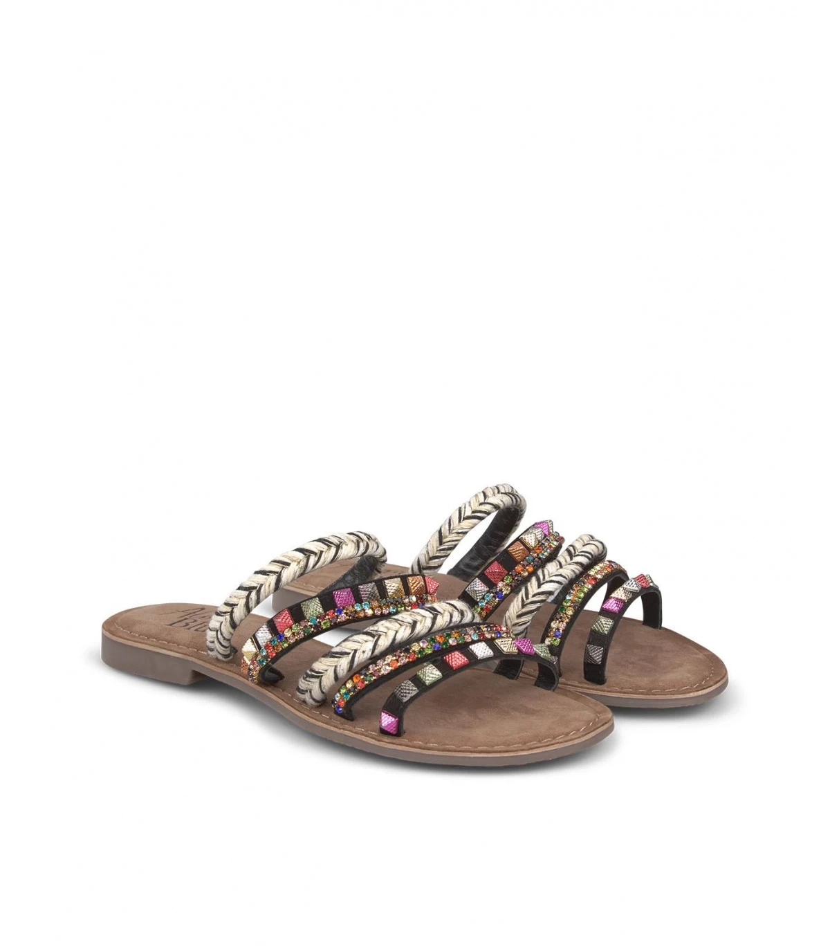 Sandalia plana con tiras de pedrerÃa y trenzados multicolor. Plantilla acolchada para un mayor confort. La altura del tacón es de 1cm.