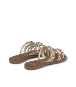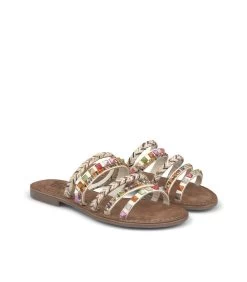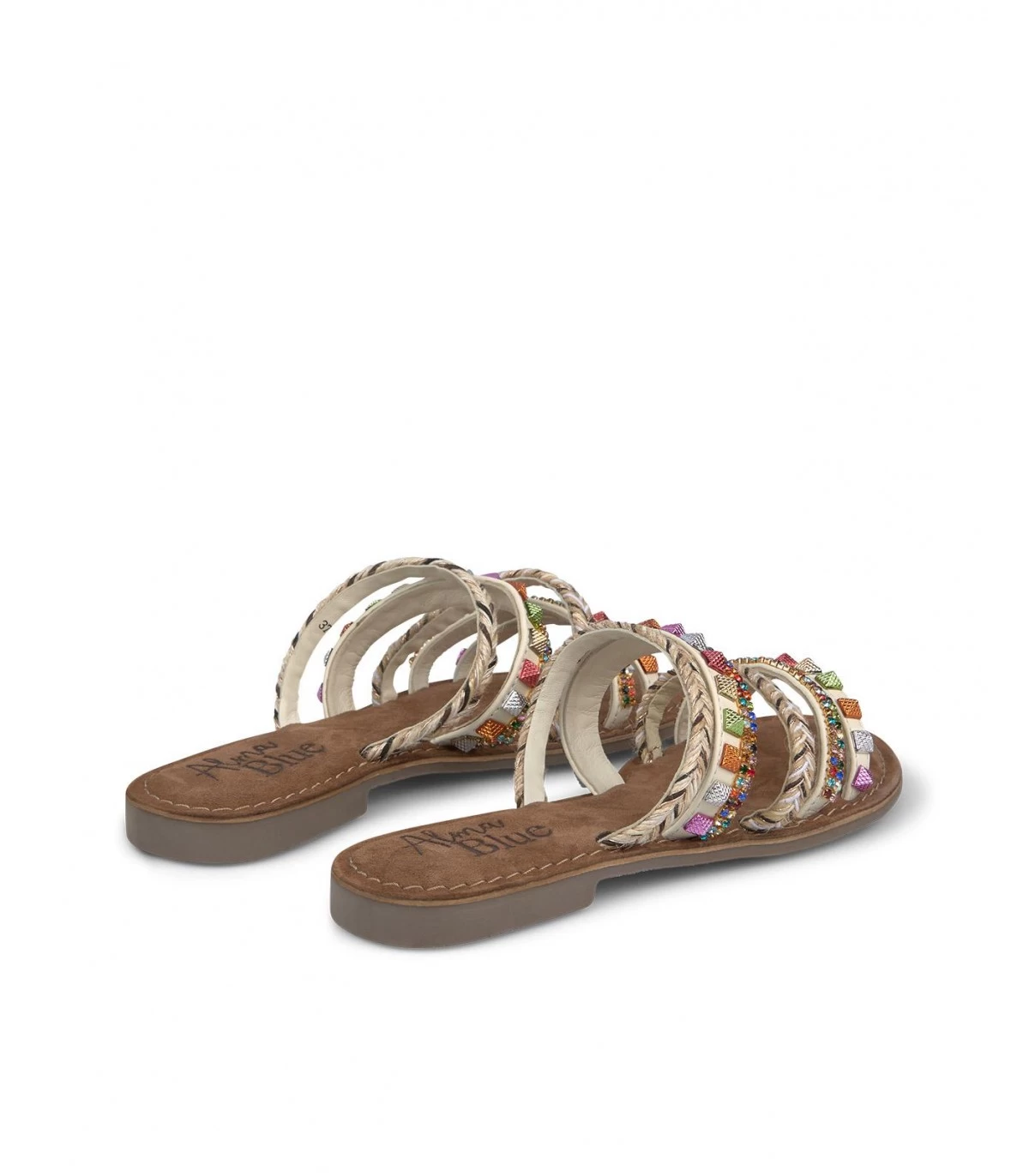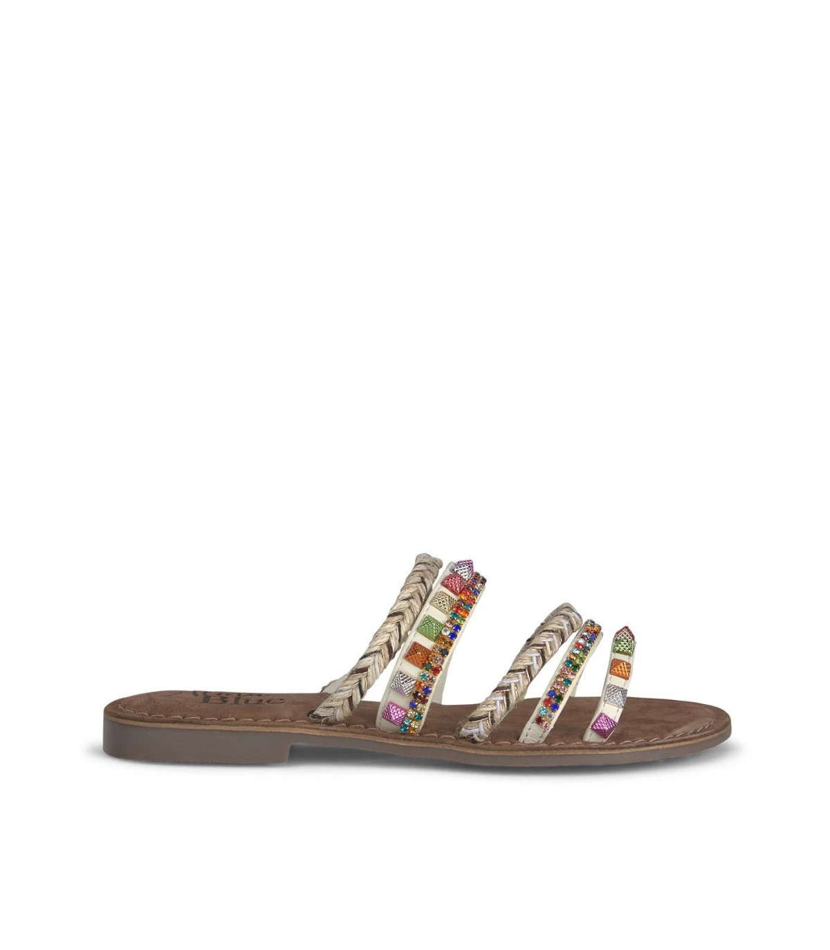 Sandalia plana con tiras de pedrerÃa y trenzados multicolor. Plantilla acolchada para un mayor confort. La altura del tacón es de 1cm.