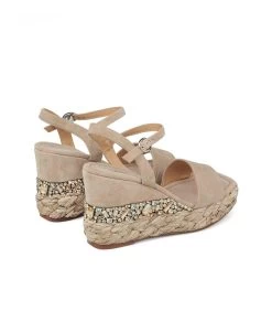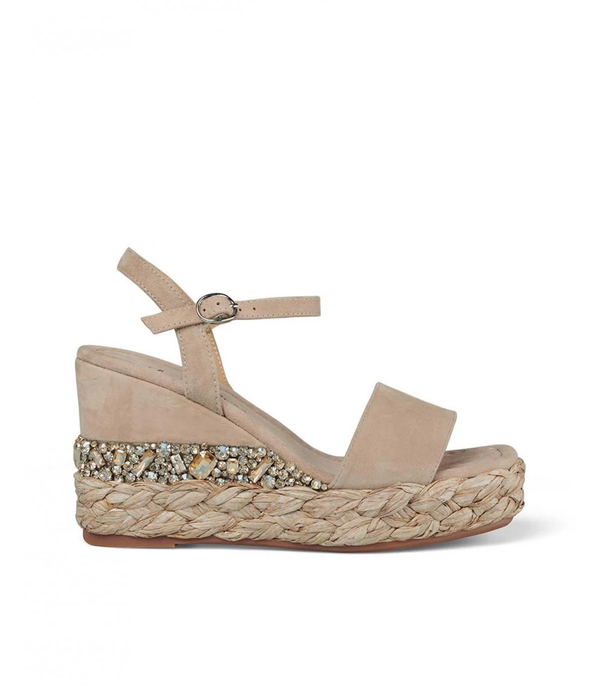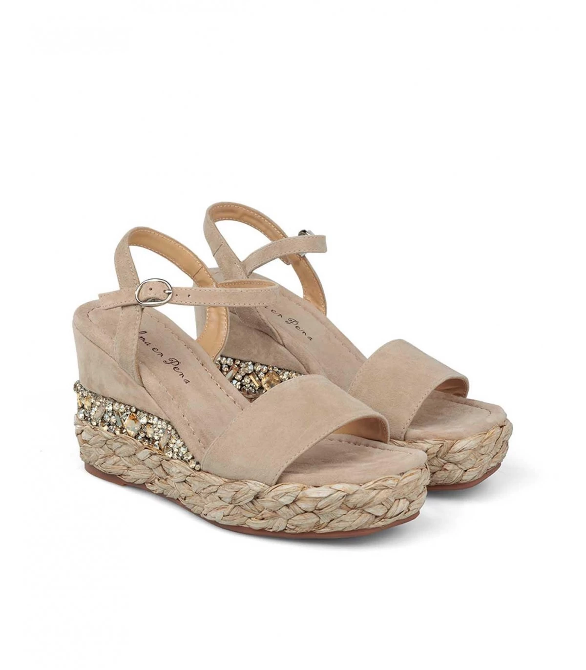 Sandalia cuña de piel con detalle trenzado y detalle de pedrería en tacón. Punta cuadrada. Cierre con hebilla en tobillo. Altura de tacón de 9,5cm