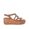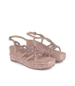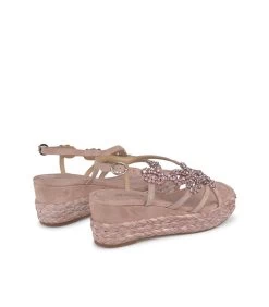 Sandalia cuña de piel con adorno de pedrería. Plantilla de piel acolchada para un mayor confort. La altura del tacón es de 6cm.