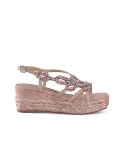 Sandalia cuña de piel con adorno de pedrería. Plantilla de piel acolchada para un mayor confort. La altura del tacón es de 6cm.