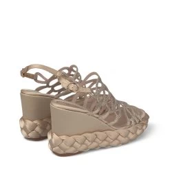 Sandalia tipo cuña con adorno trenzado y tiras de pedrería. Plantilla de piel acolchada para un mayor confort. La altura del tacón es de 9,5cm.