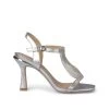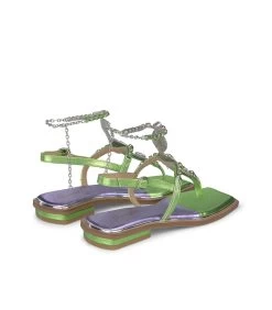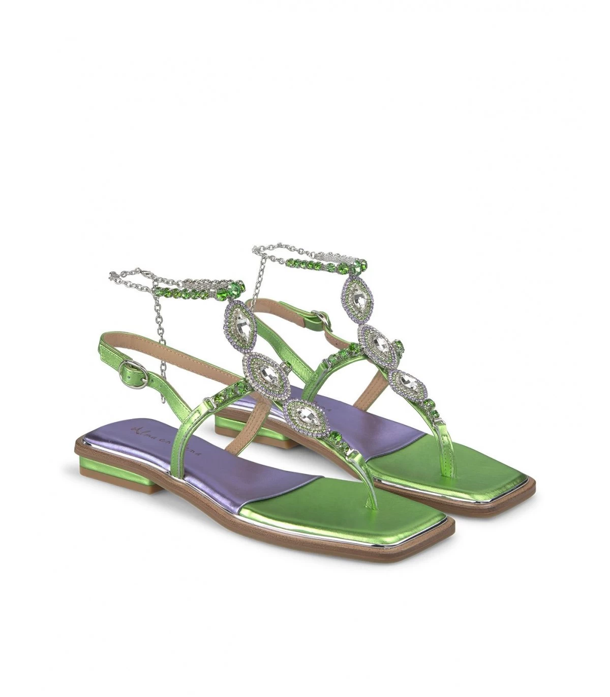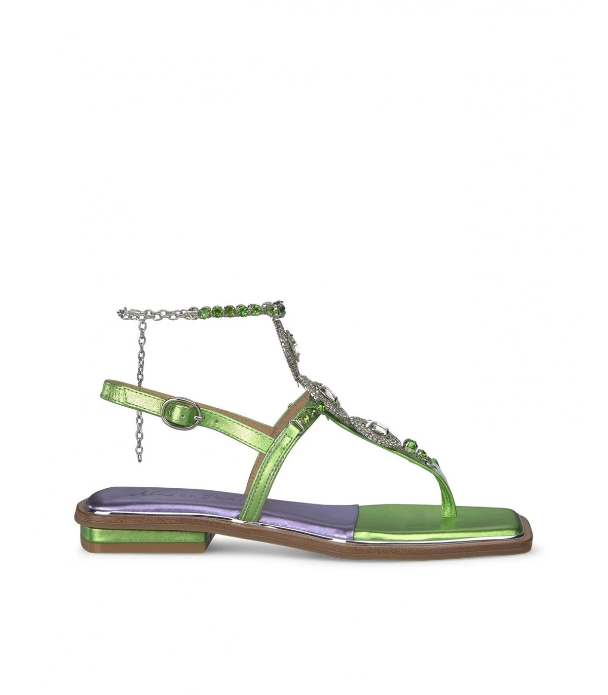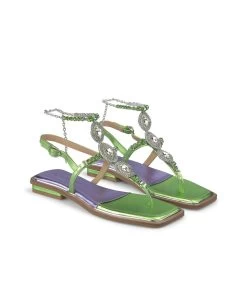 Sandalia plana con tiras cubiertas de pedrerÃa. Cierre con hebilla ajustable. Plantilla acolchada. La altura del tacón es de 1cm.