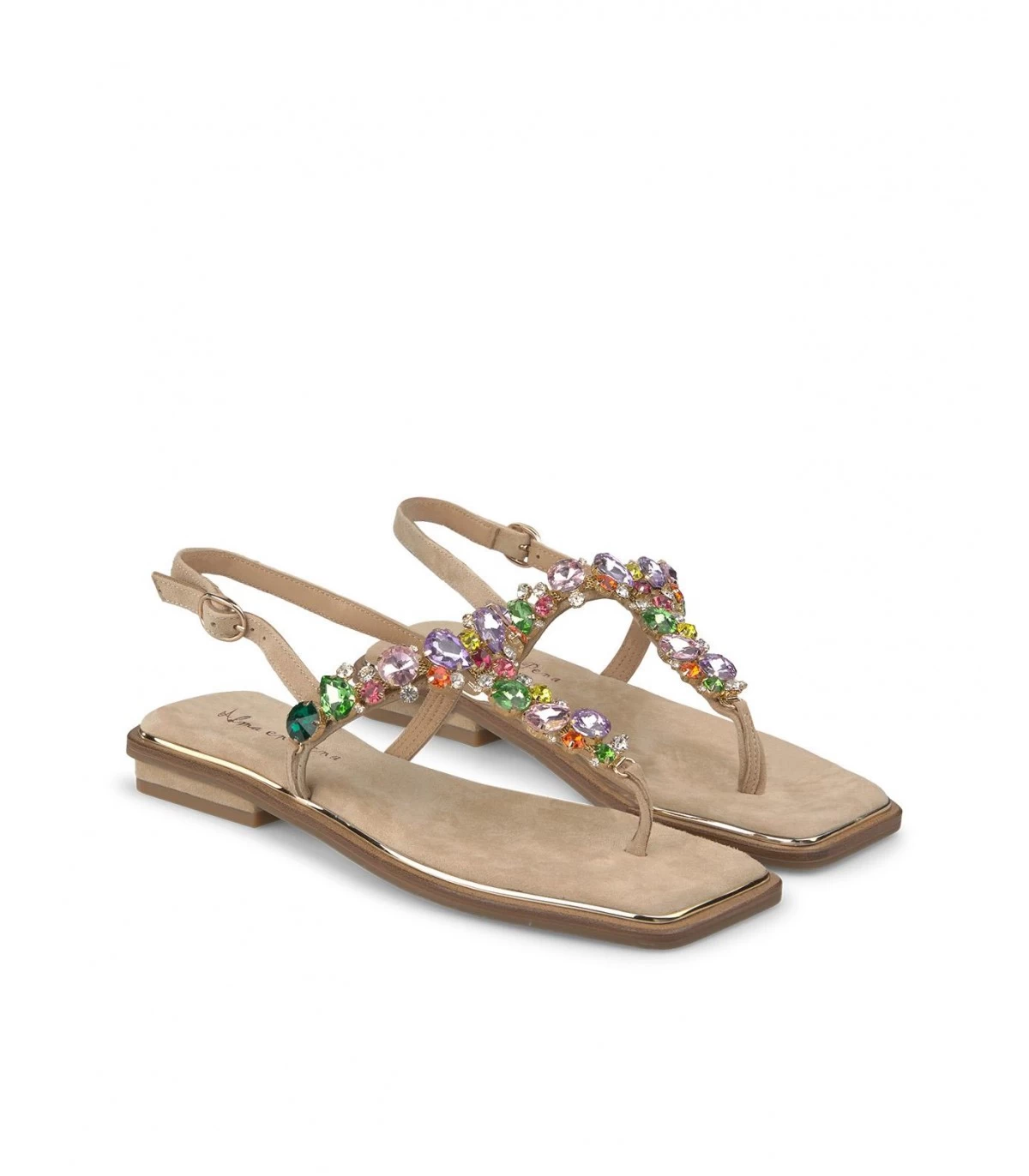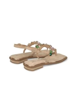 Sandalia plana de piel con tiras cubiertas de pedrerÃa. Cierre con hebilla ajustable. Plantilla acolchada de piel. La altura del tacón es de 1cm.