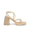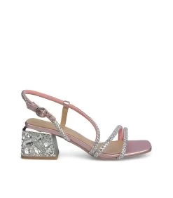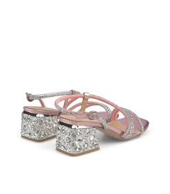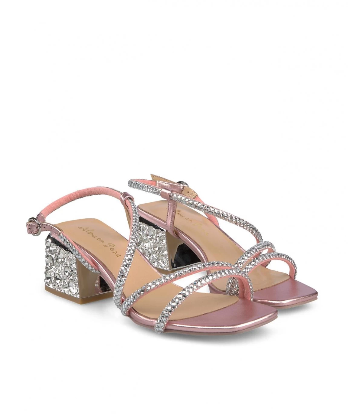 Sandalia de tacón realizada en piel cubierto de pedrerÃa y tiras delanteras con pedrerÃa. Plantilla acolchada para un mayor confort. La altura del tacón es de 6cm.