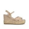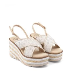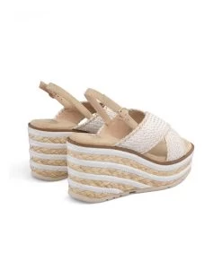 Sandalia tipo cuña con trenzado bicolor. Plantilla acolchada para un mayor confort. La altura del tacón es de 9,5cm.