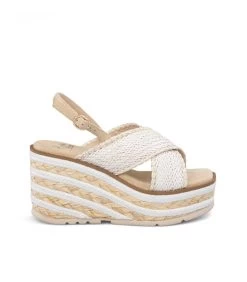 Sandalia tipo cuña con trenzado bicolor. Plantilla acolchada para un mayor confort. La altura del tacón es de 9,5cm.