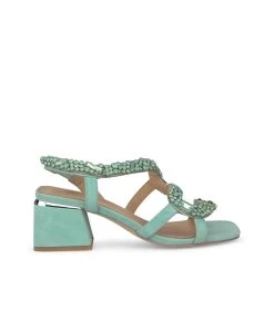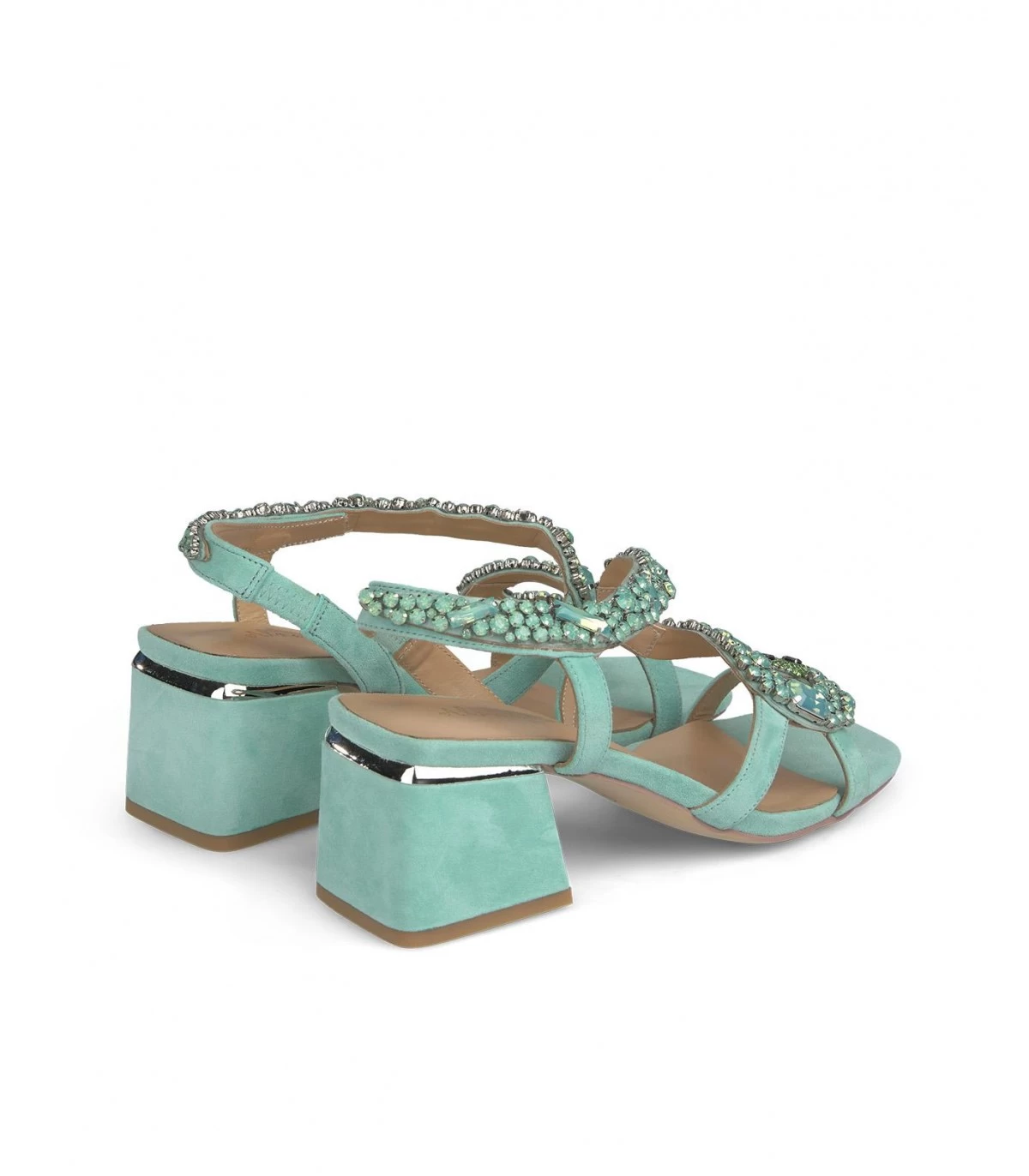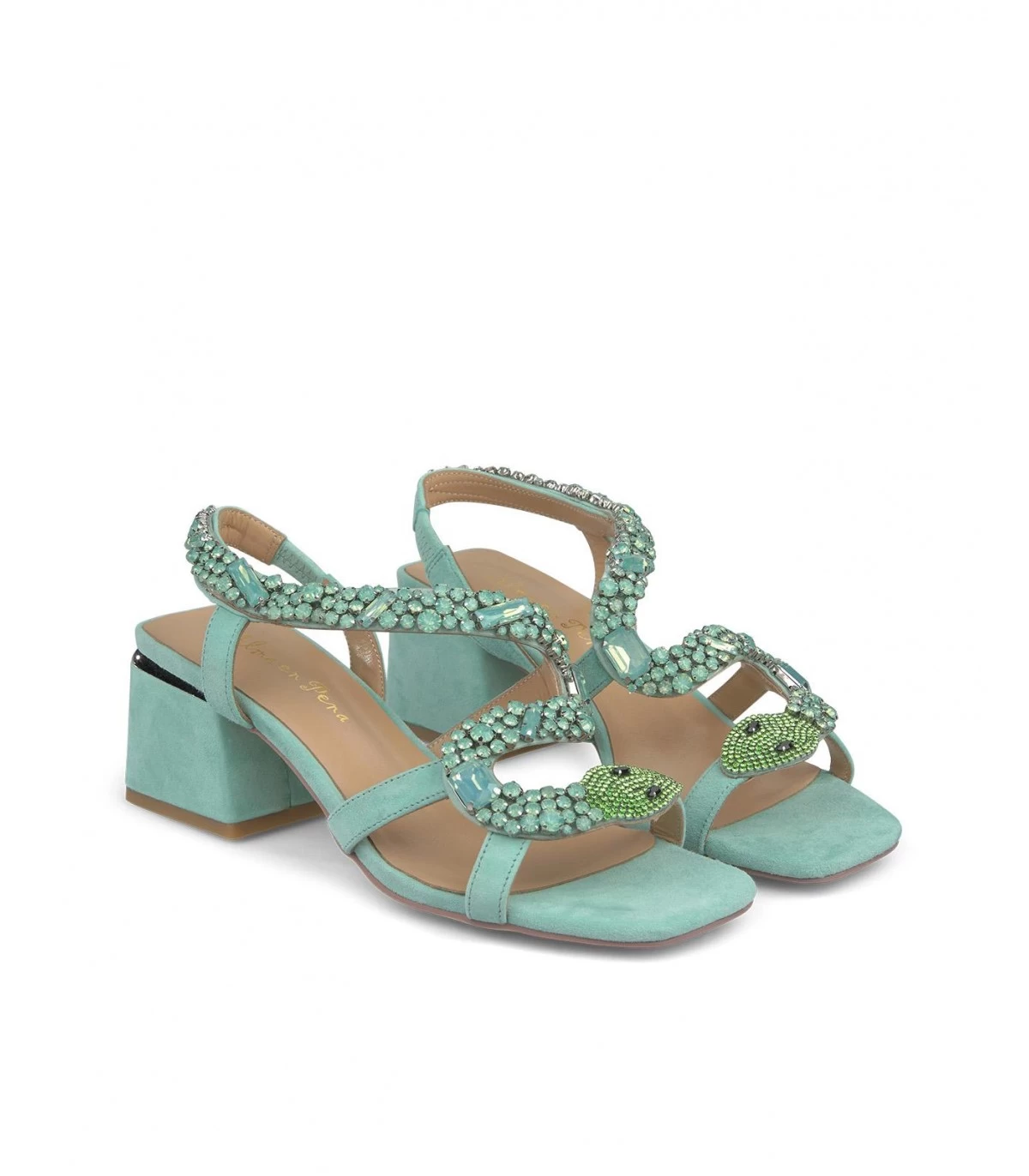 Sandalia de tacón realizada en piel con detalle de serpiente de pedrerÃa. Plantilla acolchada para un mayor confort. La altura del tacón es de 6cm.