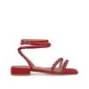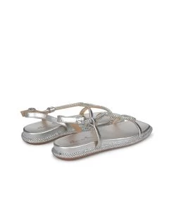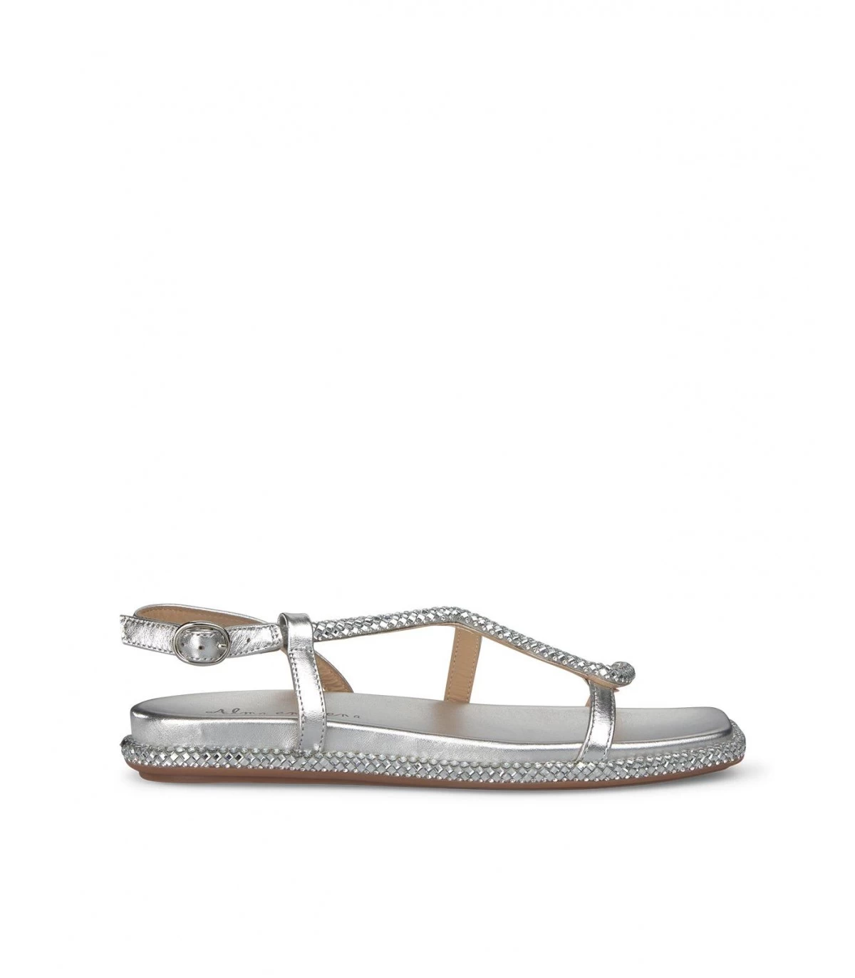 Sandalia plana y punta cuadrada con pedrerÃa. Tira de pedrerÃa en delantero. Cierre con hebilla en tobillo. Sandalia tejido y piel con suela acolchada.
