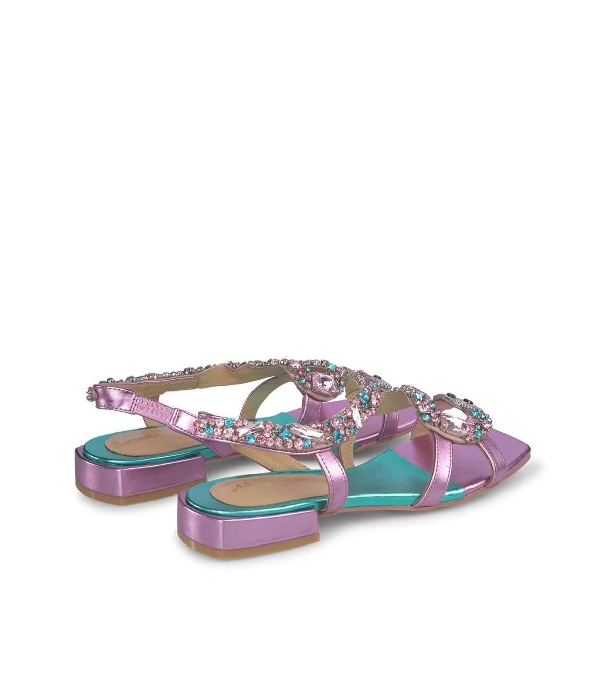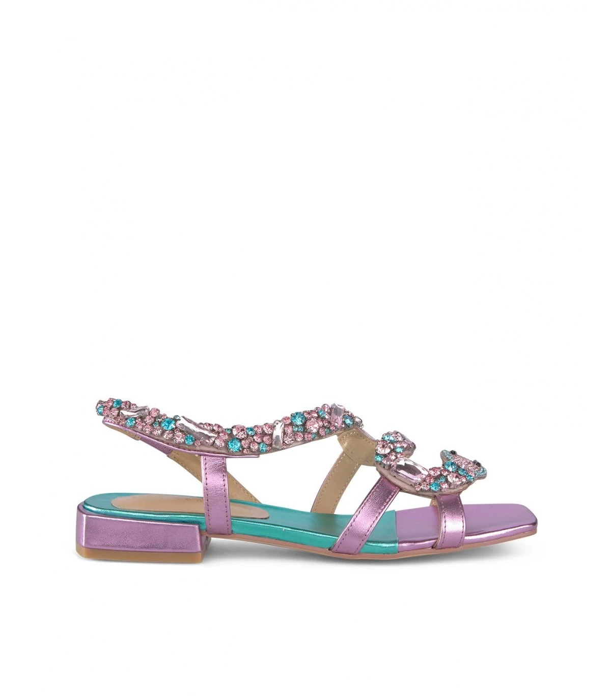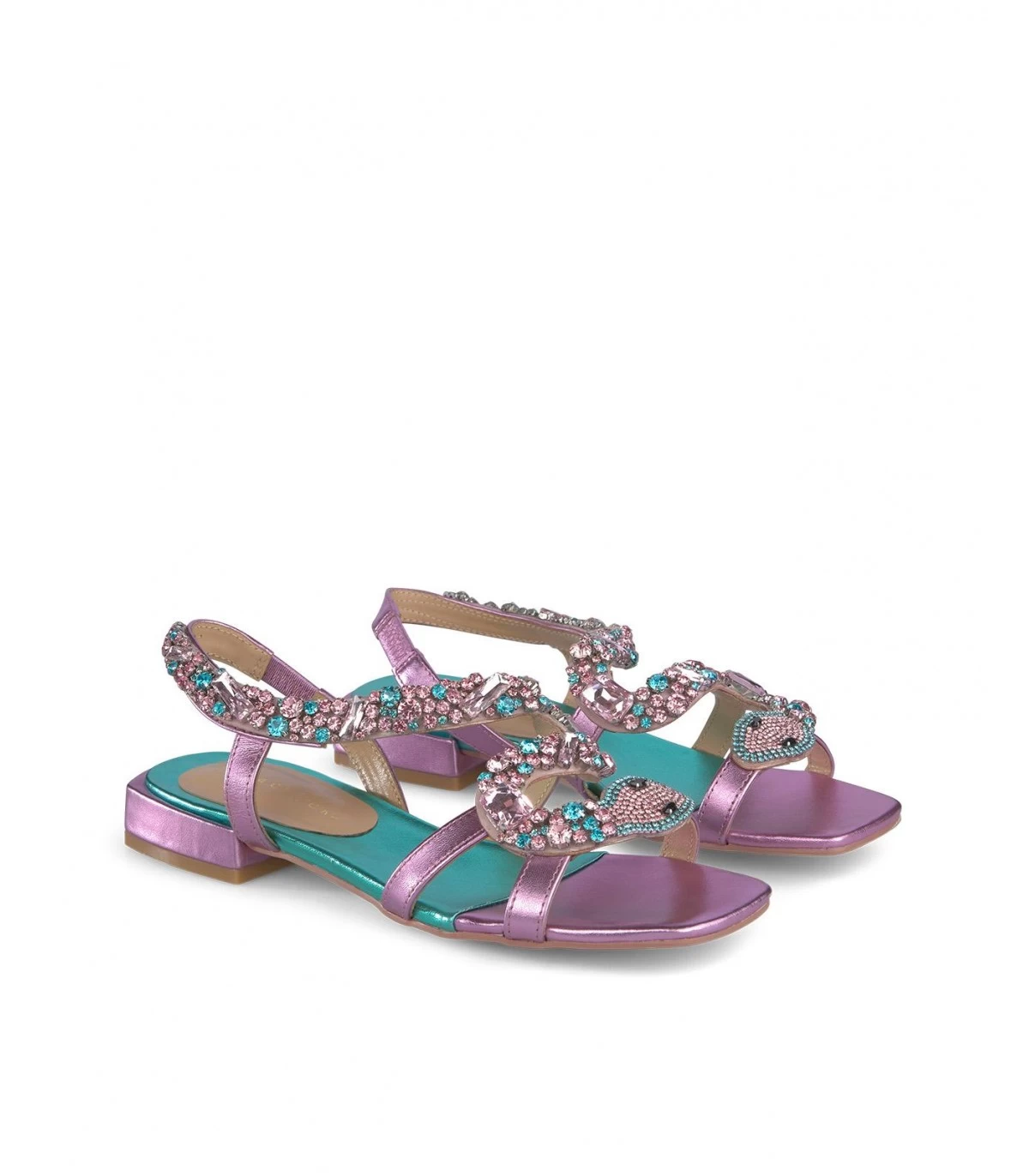 Sandalia plana bicolor con detalle de pedererÃa en forma de serpiente. Plantilla acolchada de ante. La altura del tacón es de 1cm.