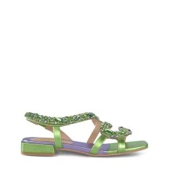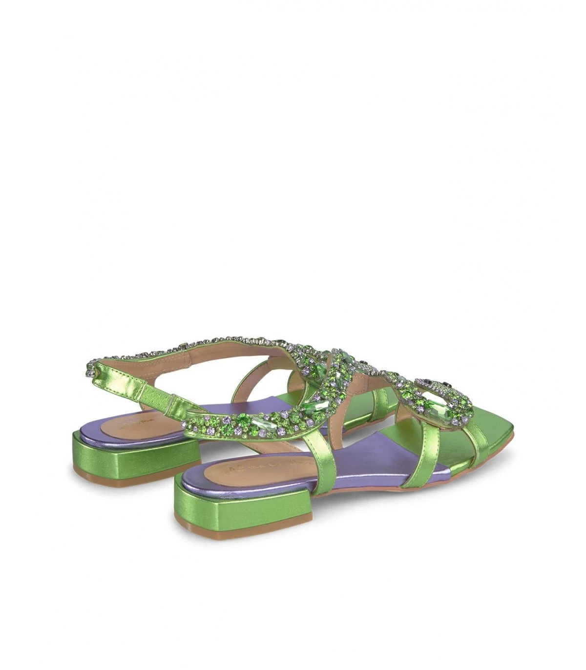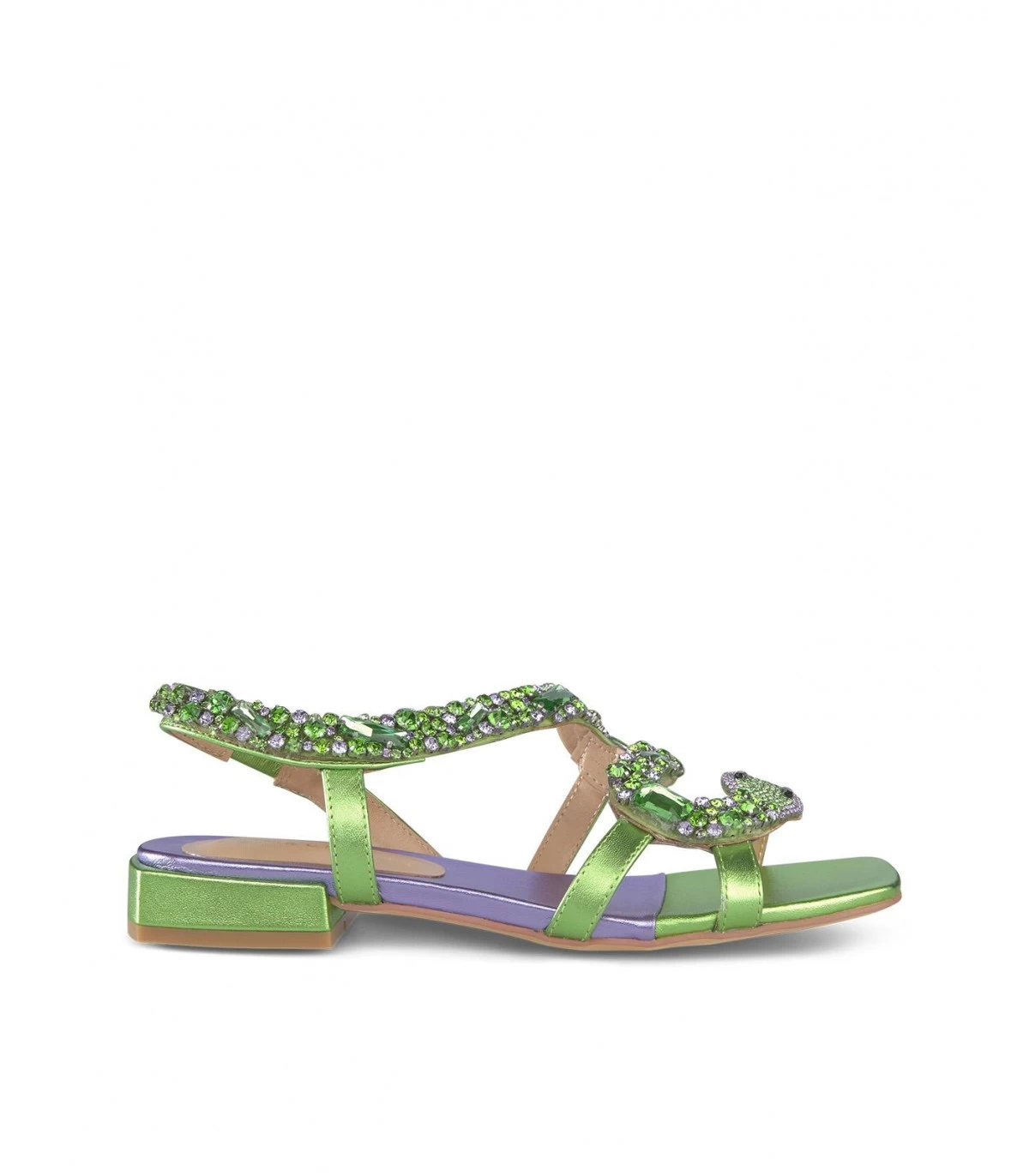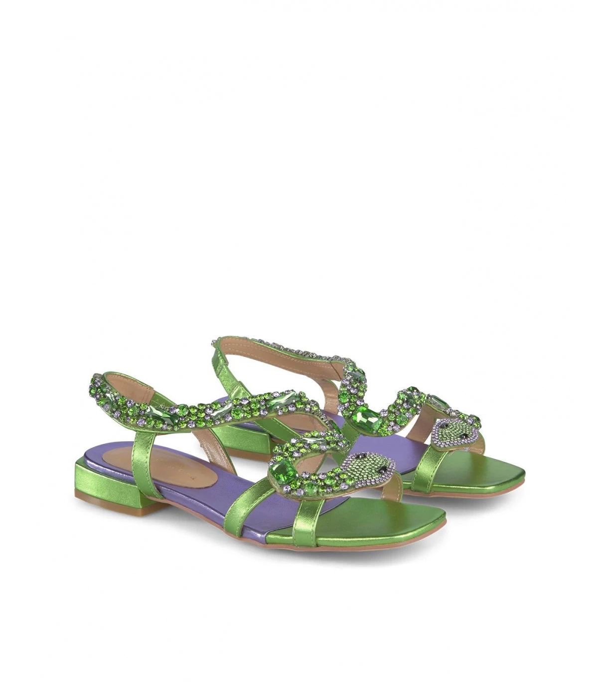 Sandalia plana bicolor con detalle de pedererÃa en forma de serpiente. Plantilla acolchada de ante. La altura del tacón es de 1cm.