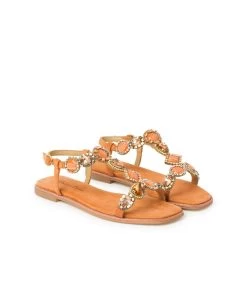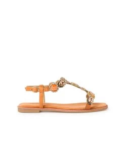 Sandalia plana de piel con tiras cubiertas de pedrerÃa. Cierre con hebilla ajustable. Plantilla acolchada de piel. La altura del tacón es de 1cm.