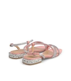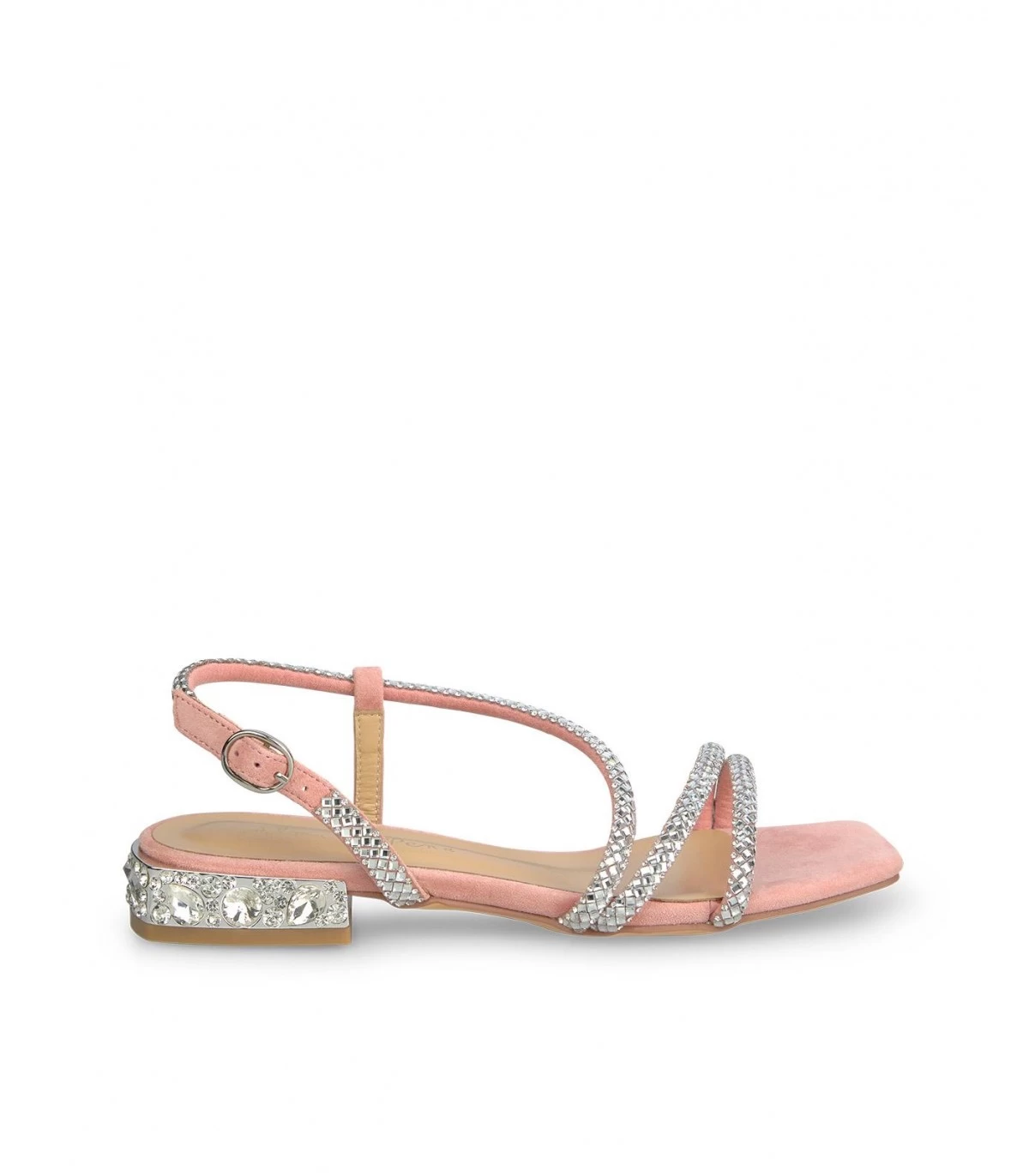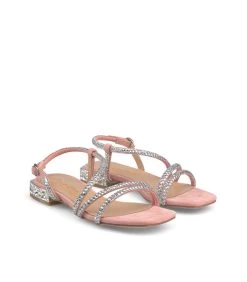 Sandalia plana de piel con tacón de pedrerÃa y tiras entrecruzadas. Cierre con hebilla ajustable. Plantilla acolchada para un mayor confort. La altura del tacón es de 1cm.