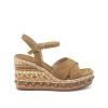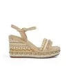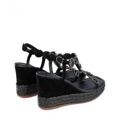 Sandalia cuña de piel con detalle trenzado y detalle de pedrería en delantero. Punta cuadrada. Cierre con hebilla en tobillo. Altura de tacón de 9,5cm.