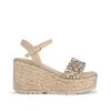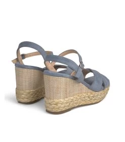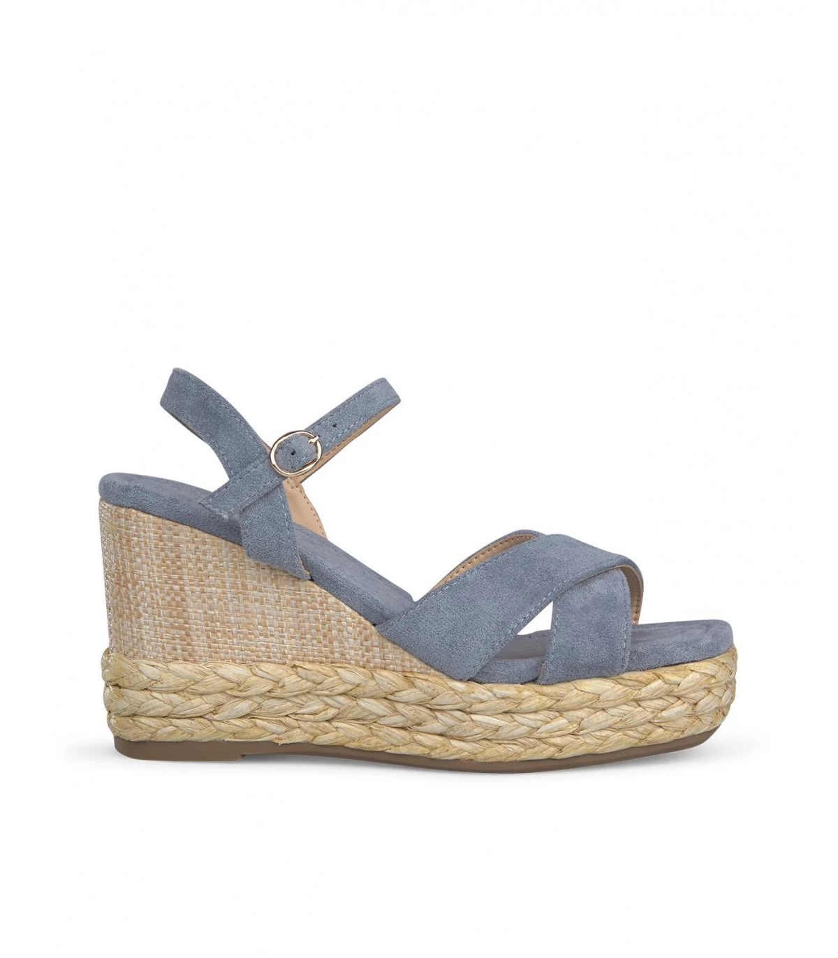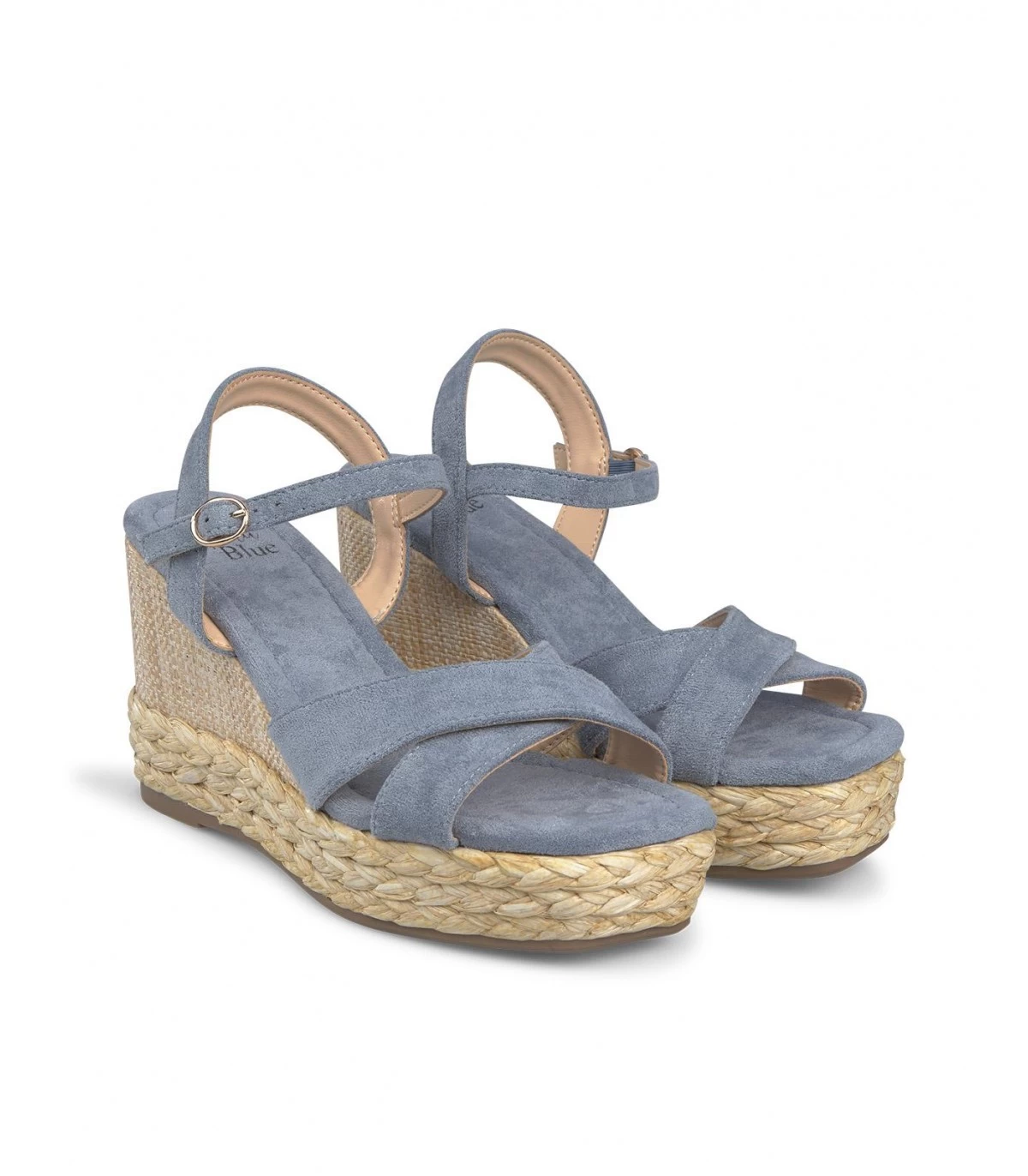 Sandalia tipo cuña con detalle de rafia combinada trenzada. Plantilla acolchada para un máximo confort. Cierre de hebilla ajustable. Altura del tacón 9,5cm.